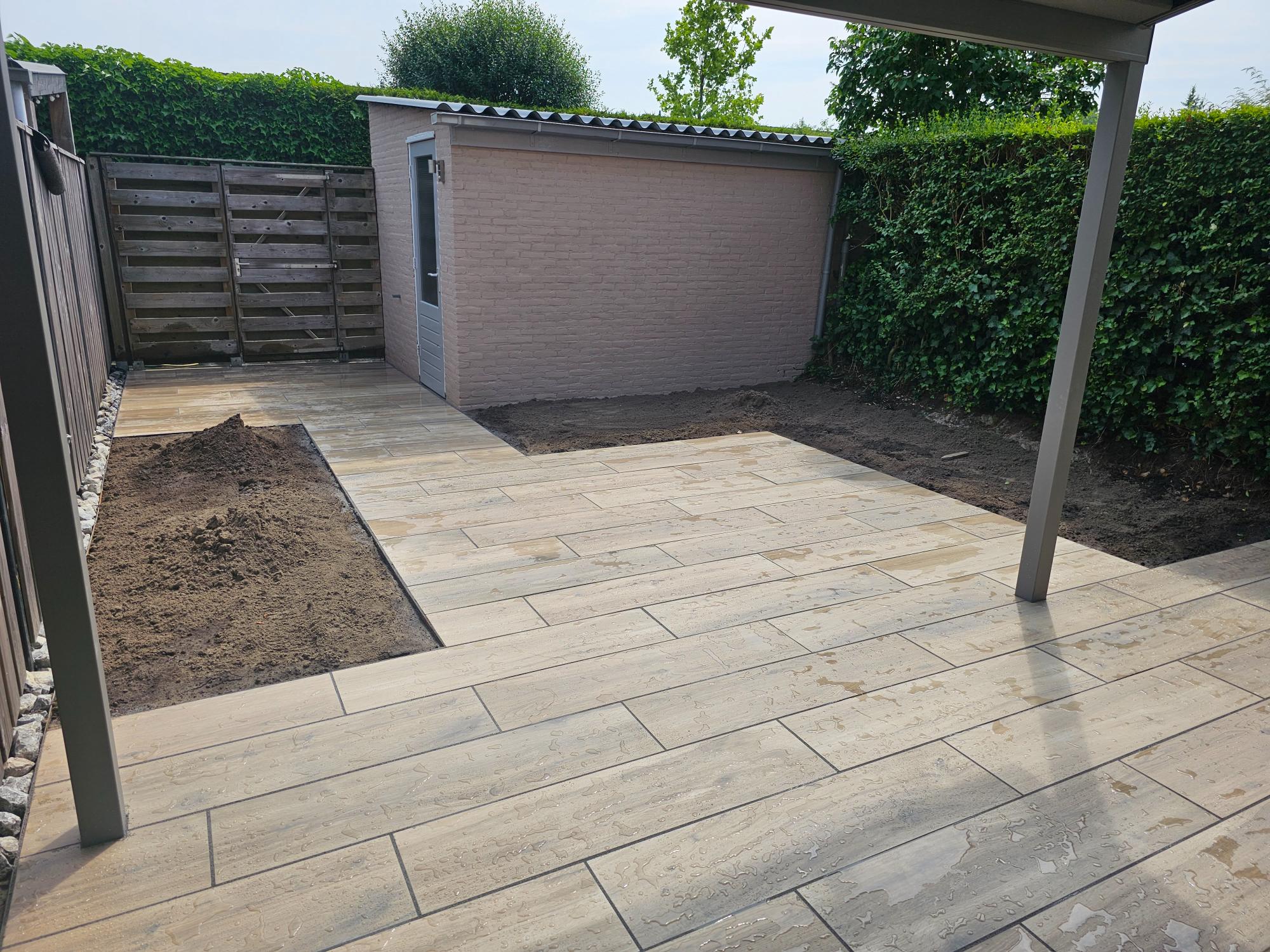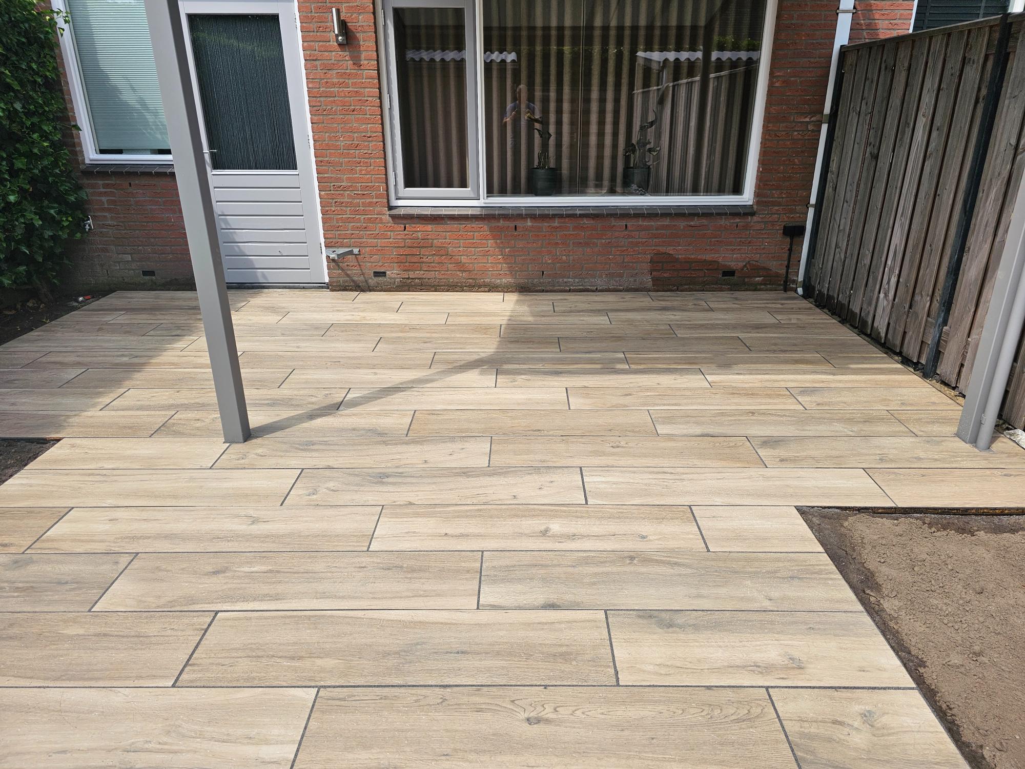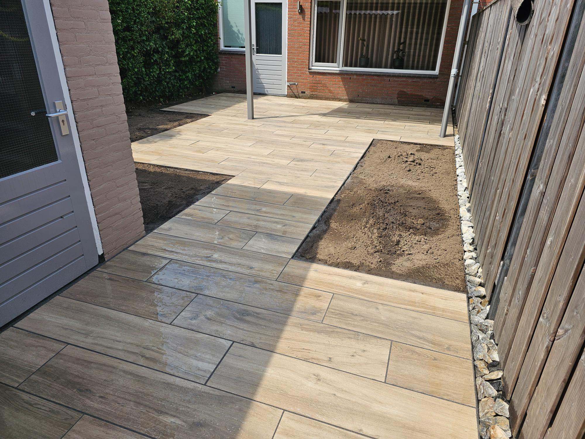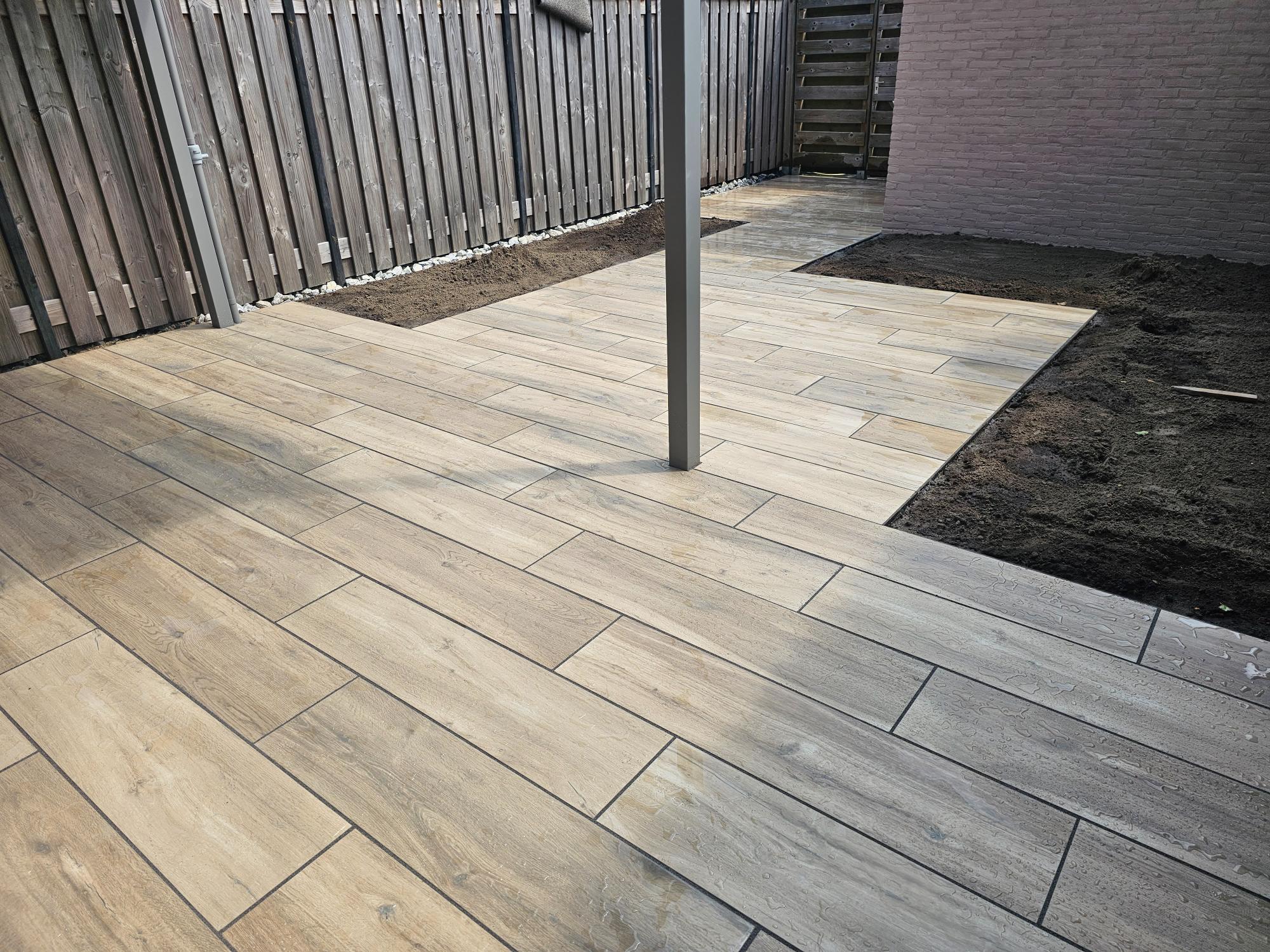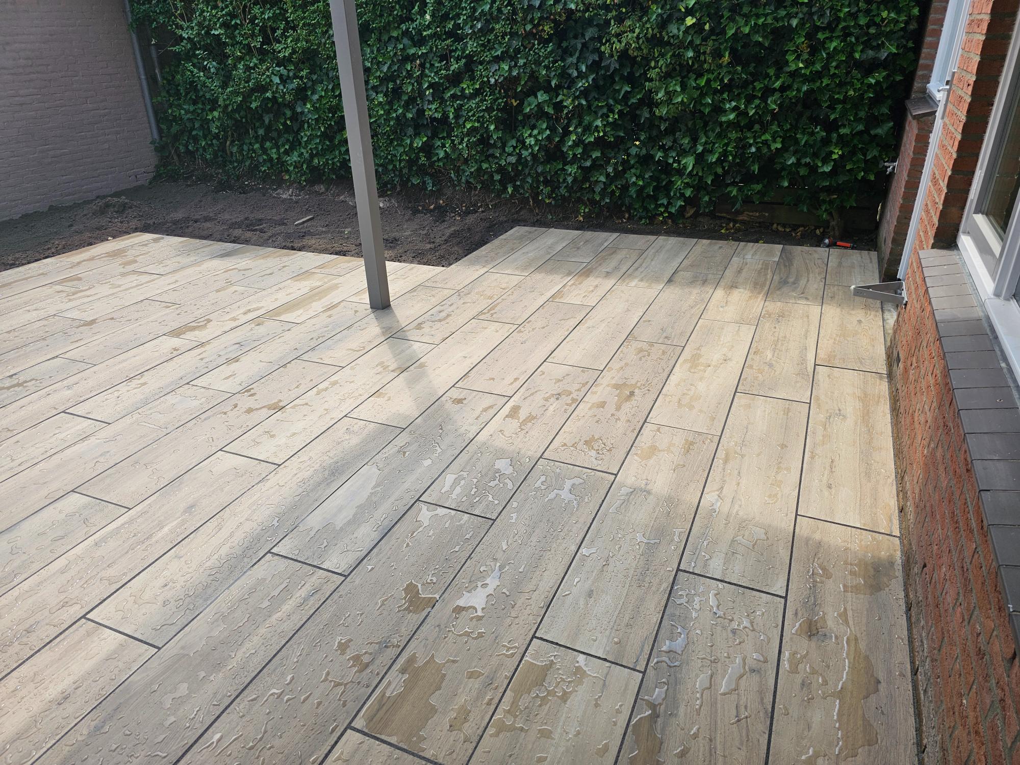 In deze tuin hebben wij een terras van keramische planktegels 30 x 120 cm gelegd en daarna gevoegd. De ondergrond is gestabiliseerd zodat de tegels niet verzakken. Omdat de tegels bol lopen hebben wij rekening gehouden met de manier waarop wij ze gelegd hebben, namelijk telkens een derde deel verspringend. Hierdoor ontstaan er geen “stootranden” en is de afwerking optimaal.