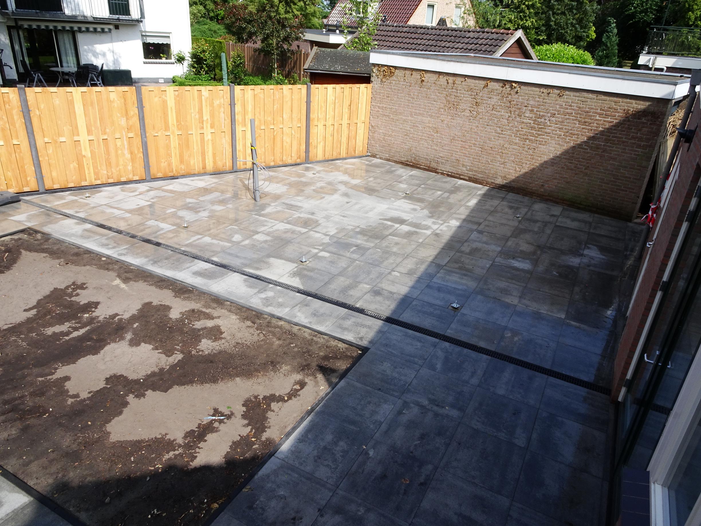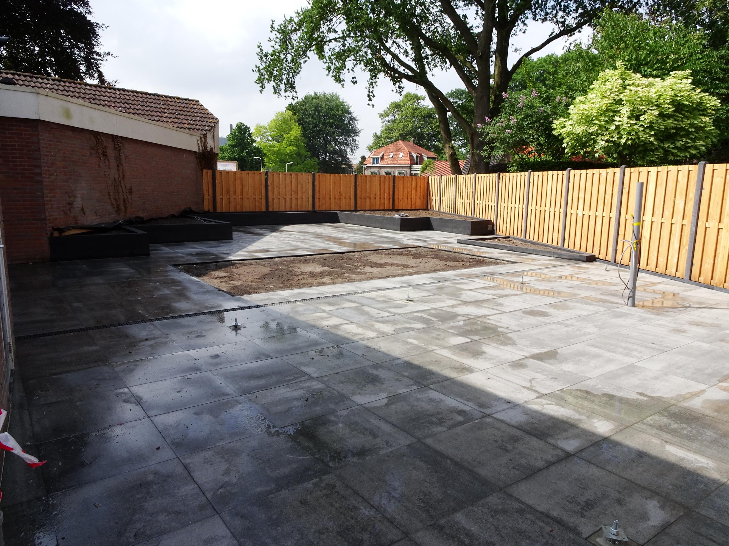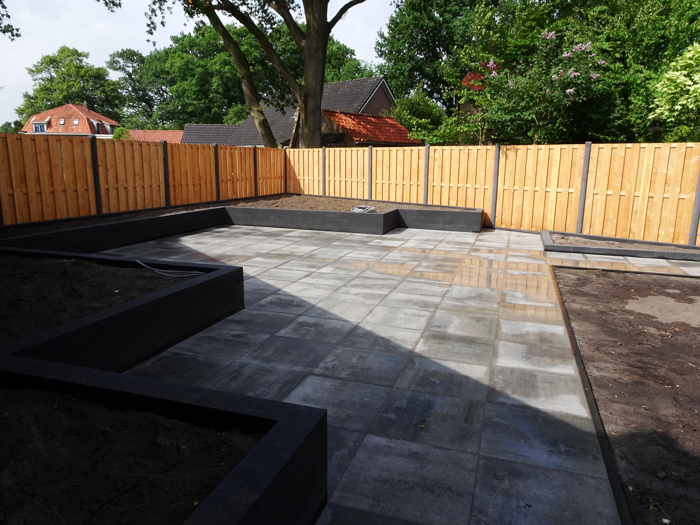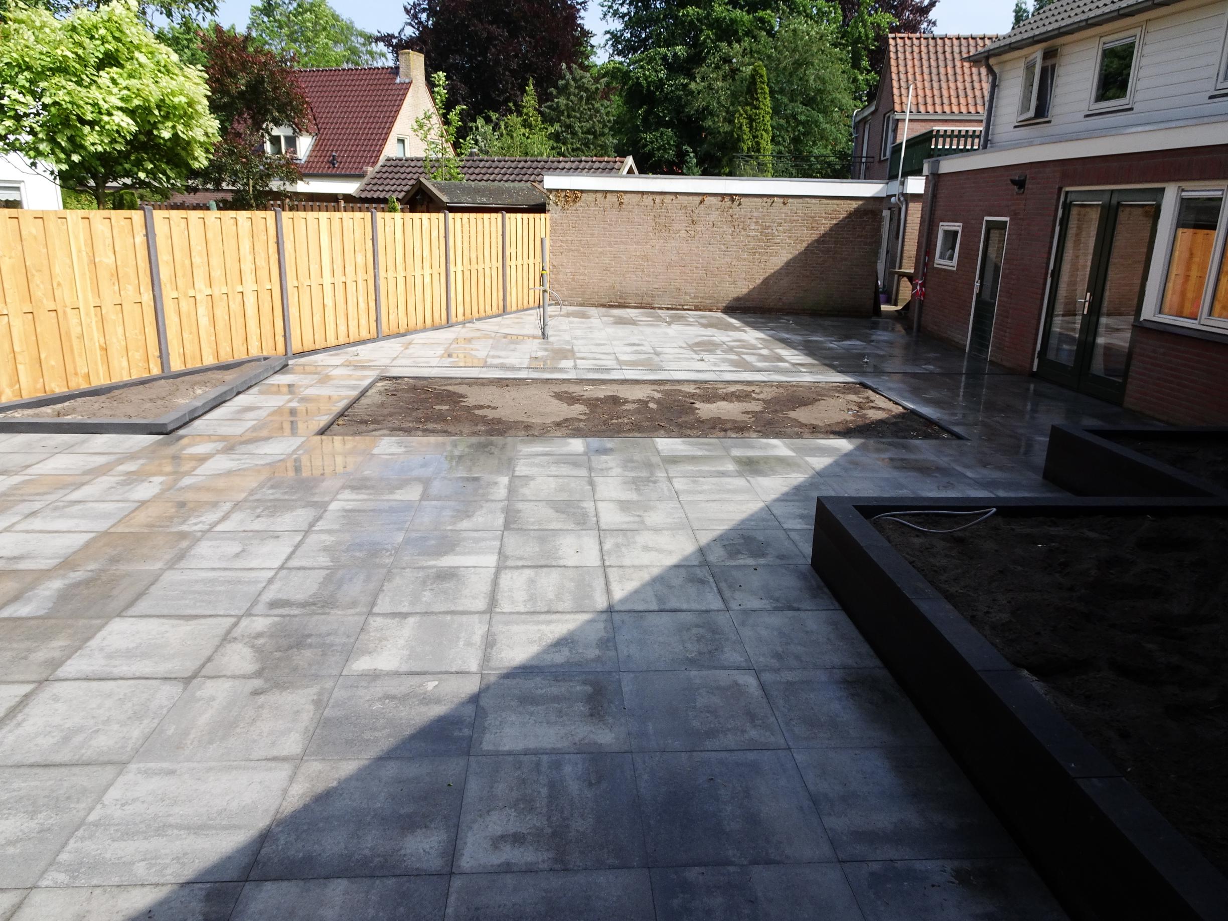 In deze achtertuin in Heino hebben wij een terras van betontegels 60 x 60 cm gelegd. Daarna zijn deze gevoegd om in de toekomst zo min mogelijk onkruid te krijgen. Voor de nog te bouwen overkapping hebben wij al diverse voorbereidingen getrokken. Tevens hebben wij een afvoergoot aangebracht om al het water af te voeren. Om borders te creëren hebben wij op diverse plekken muurelementen geplaatst.