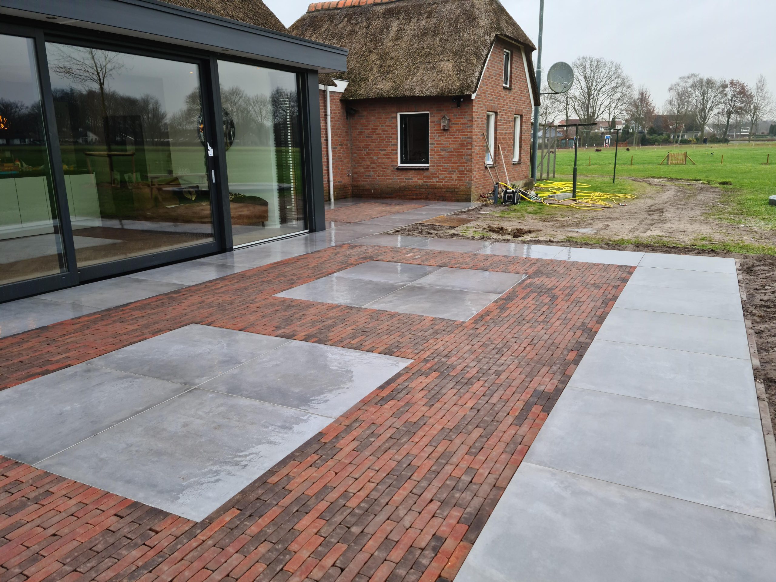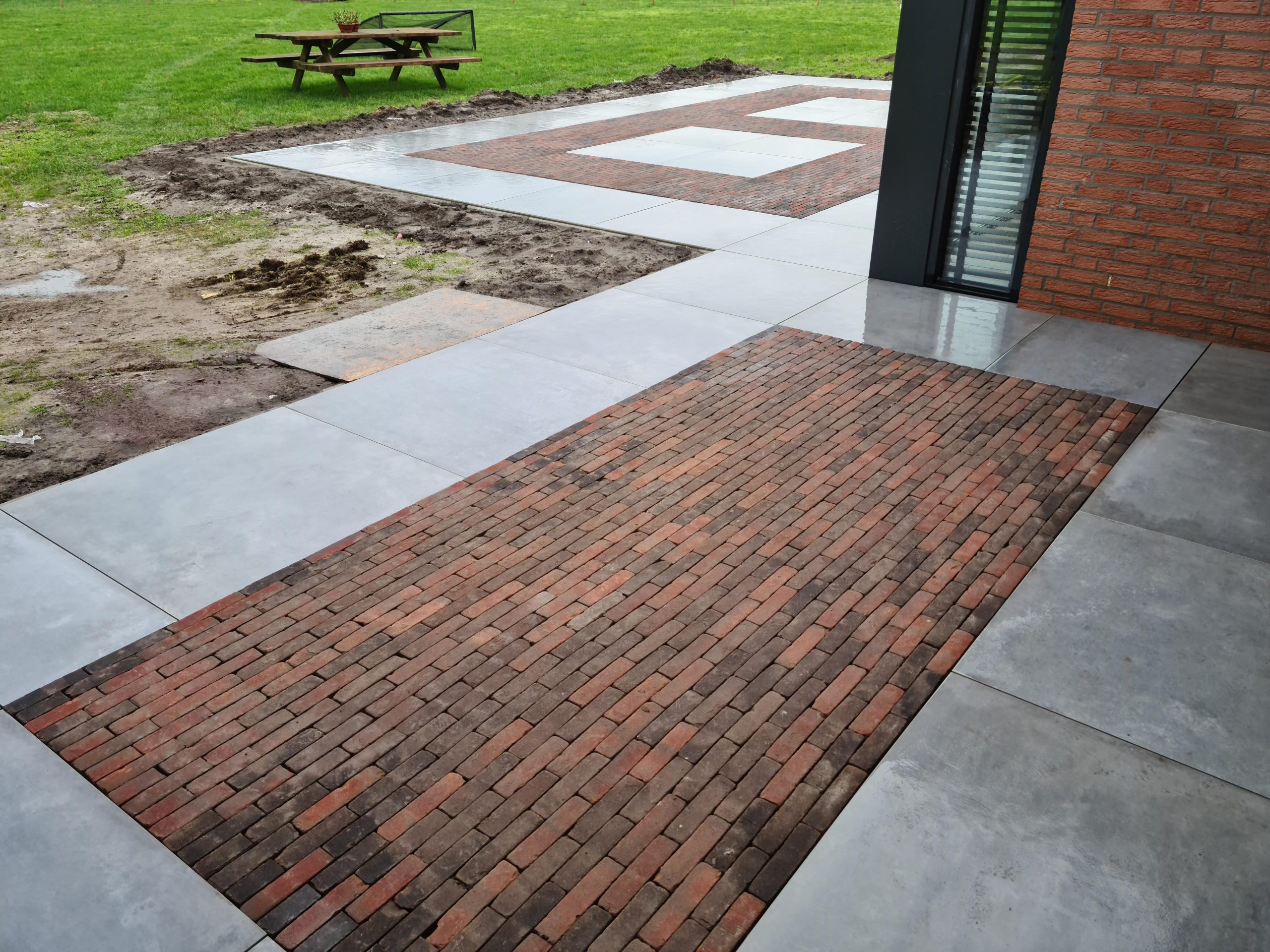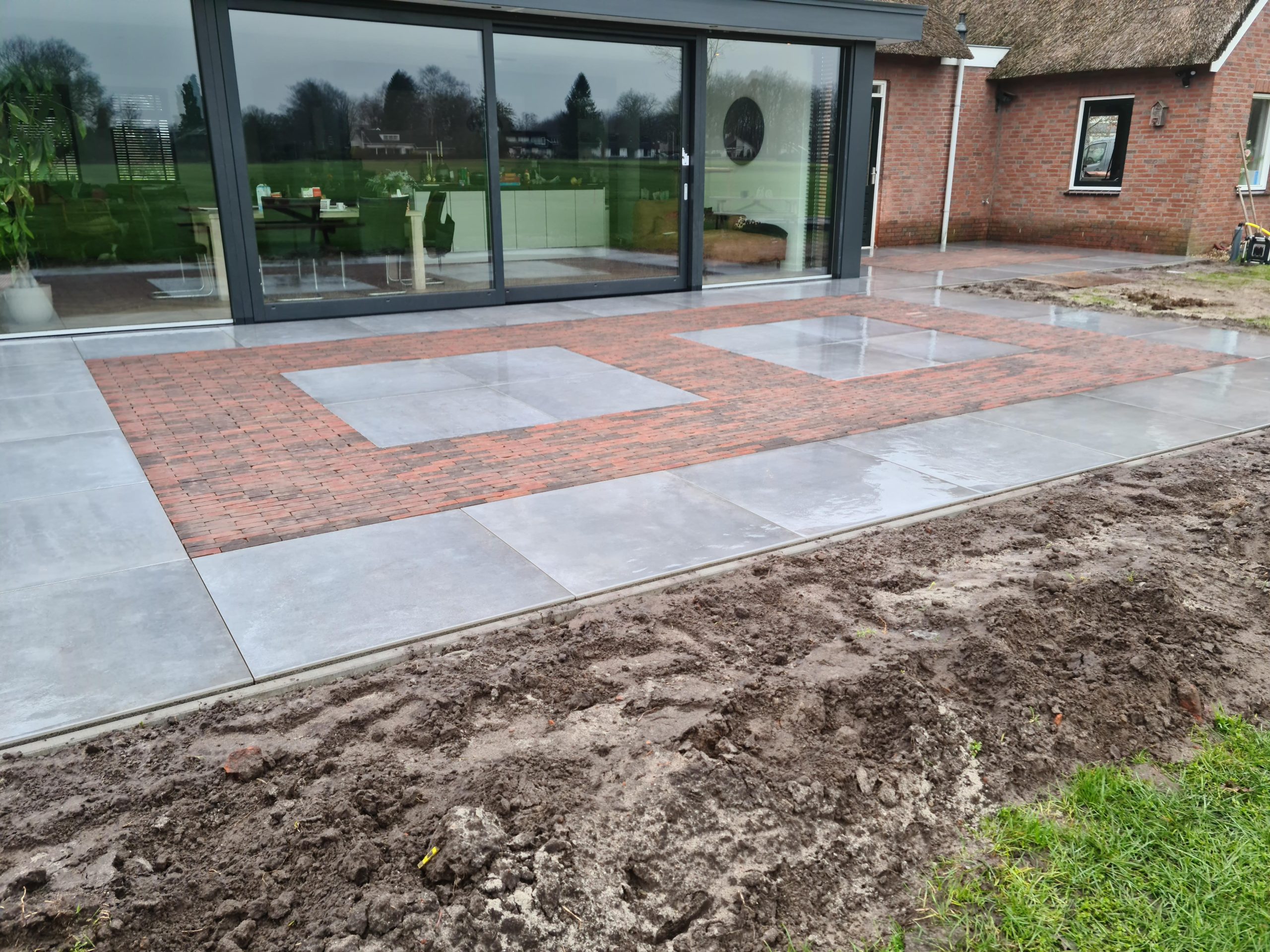Bij deze pas verbouwde woning zijn er keramische tegels van een groot formaat gelegd (100 x 100 cm). Om een speels effect te geven, hebben wij in het midden van het terras gebakken waaltjes verwerkt. Het materiaal konden wij makkelijk bij het werk krijgen met behulp van onze minishovel.
