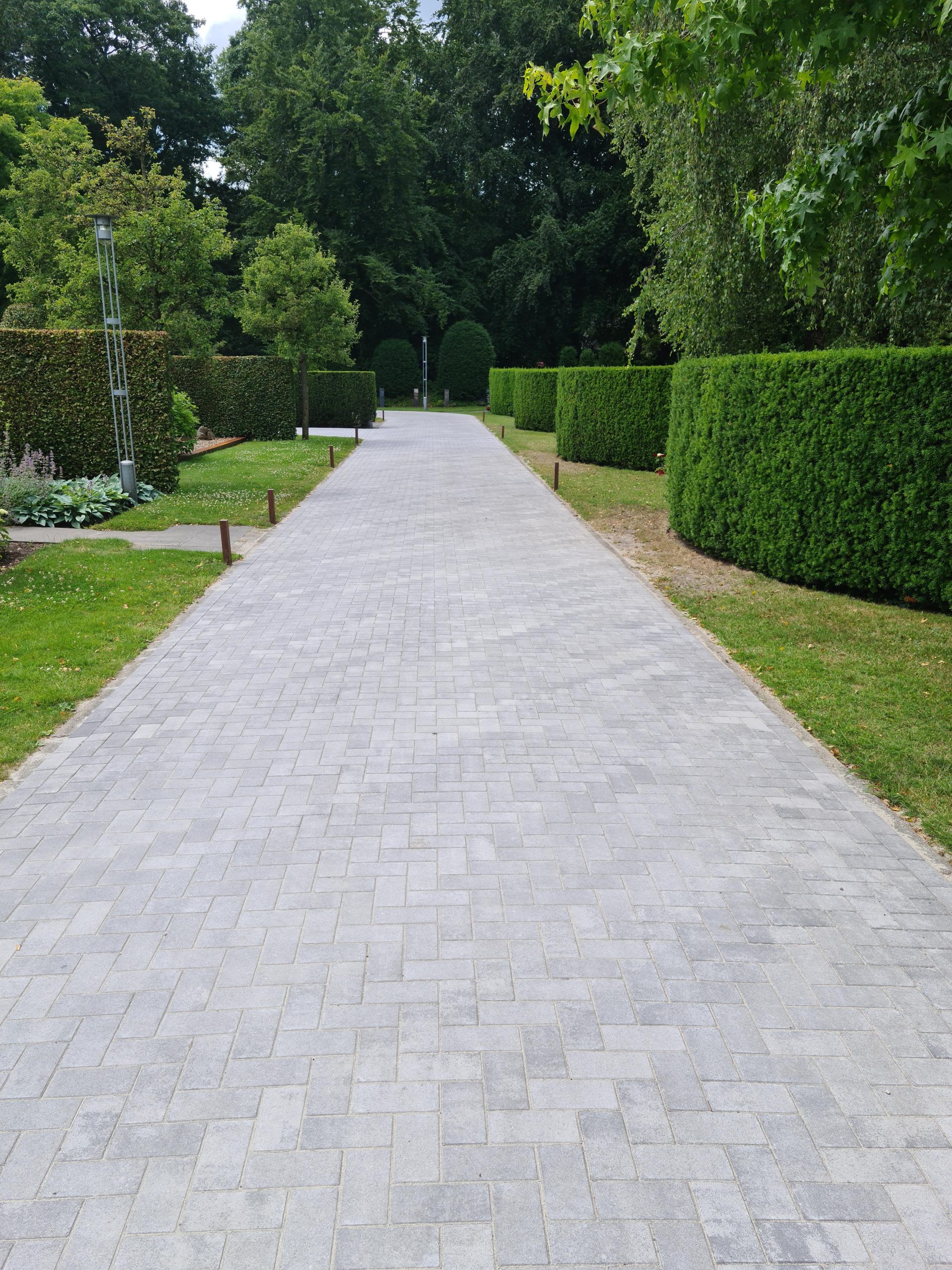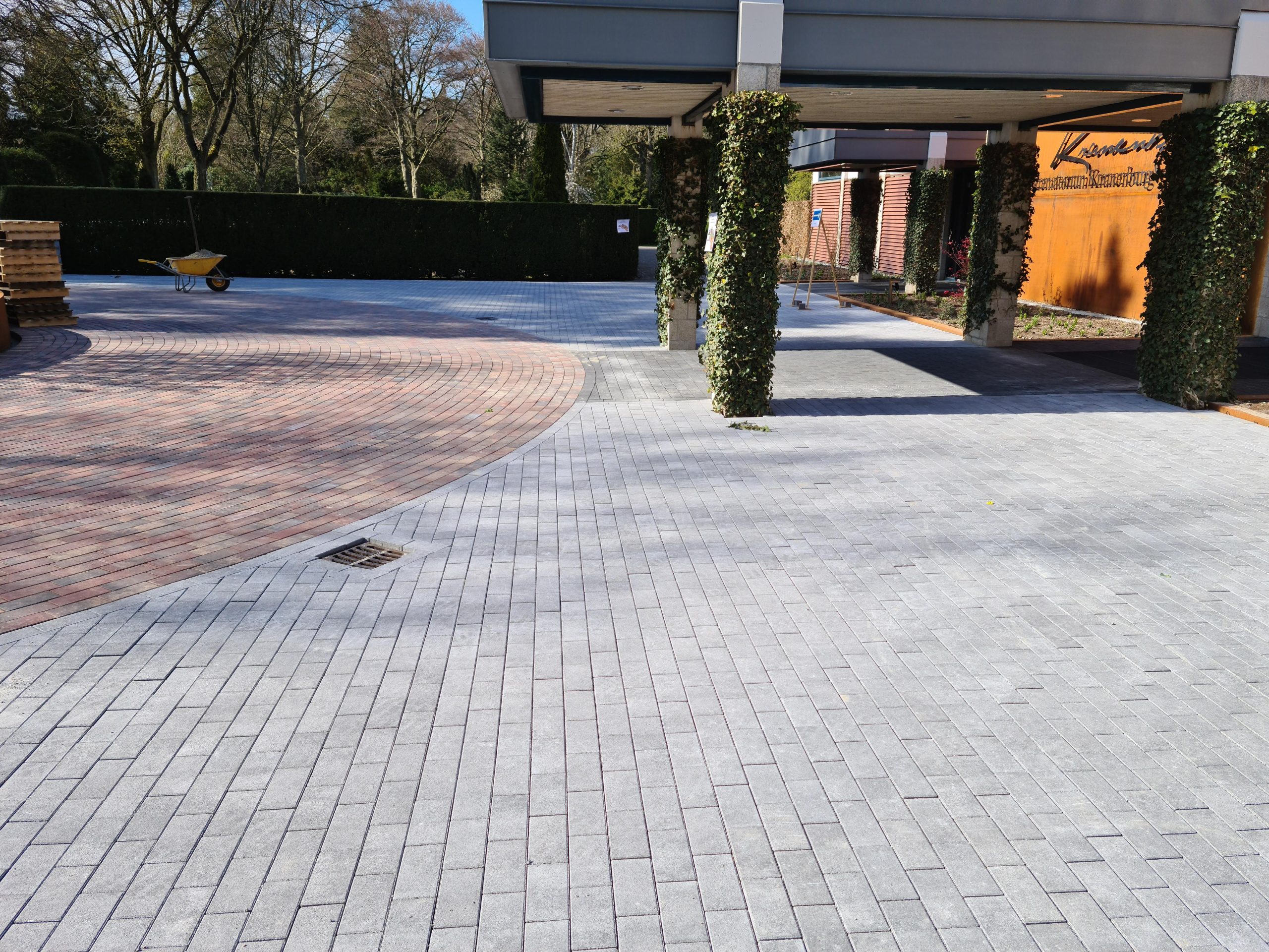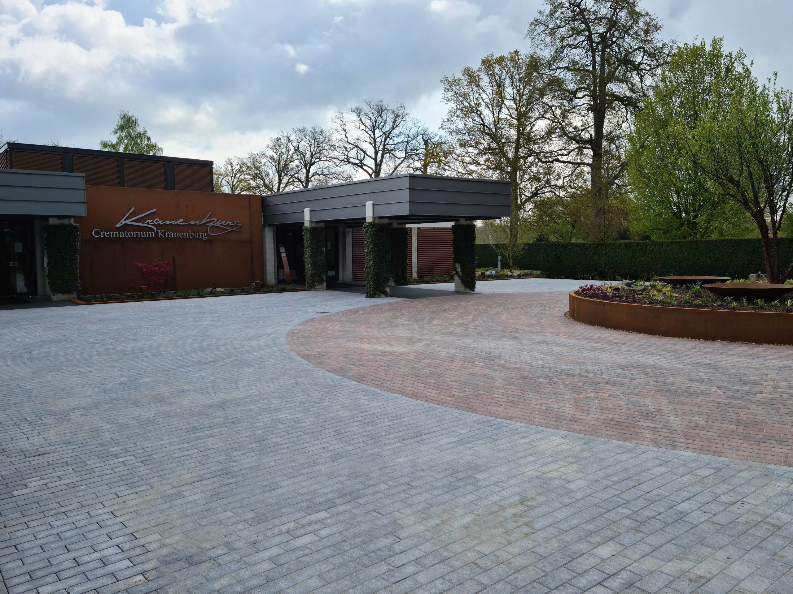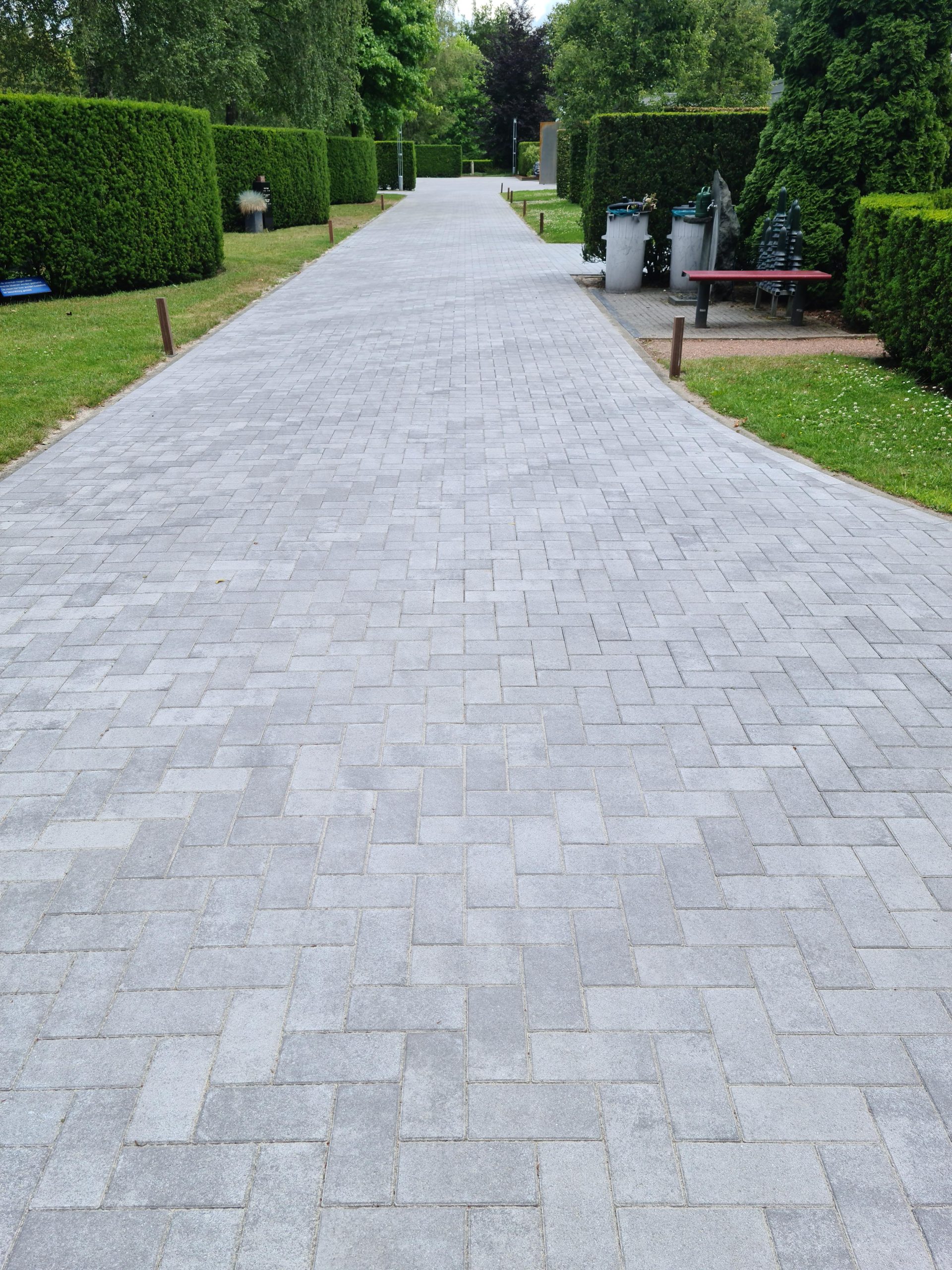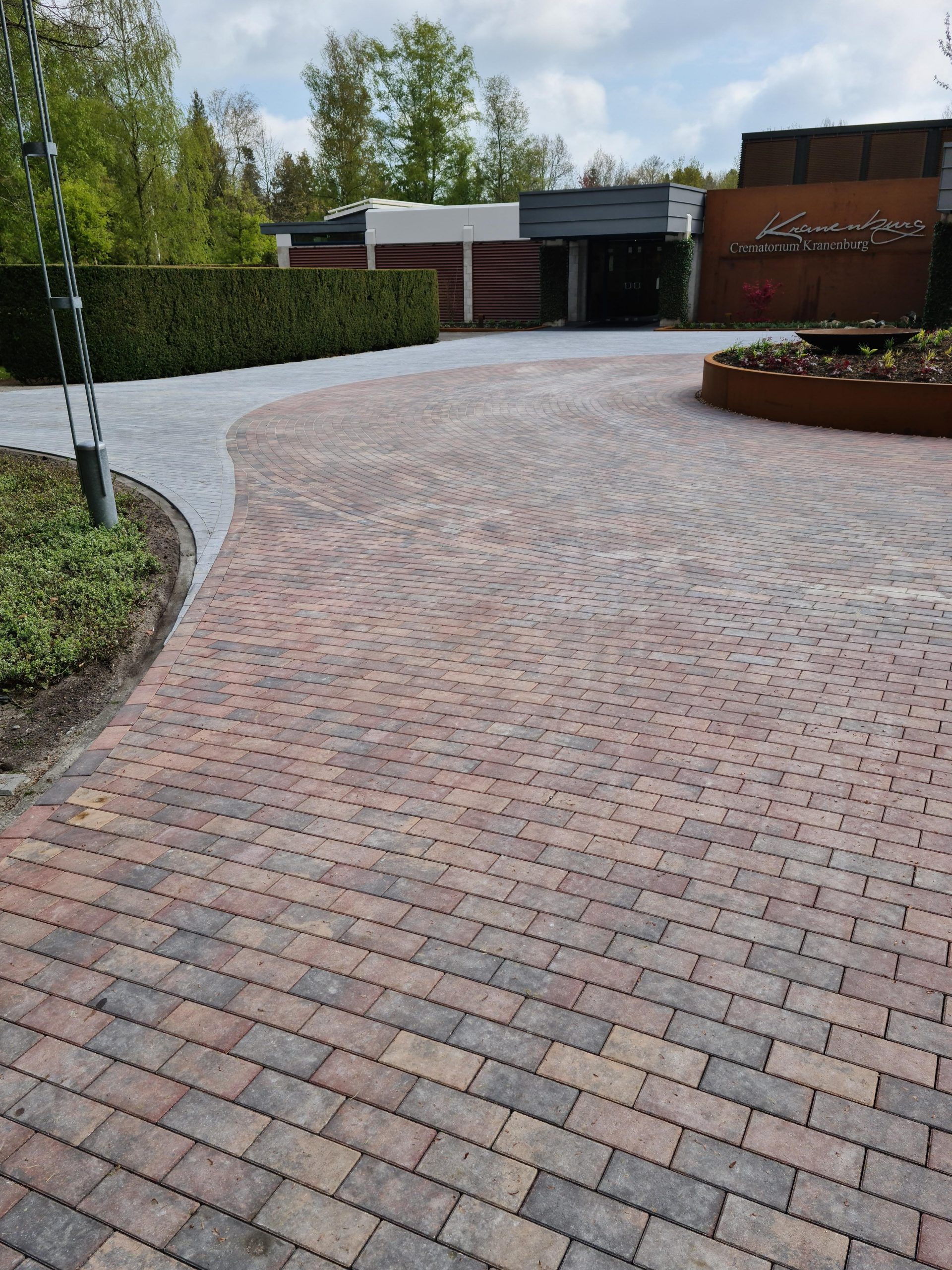Een project waar wij zeer trots op zijn is de aanleg van 1.800 m² bestrating rondom het crematorium te Zwolle. Door de vele rondingen binnen dit project hebben wij alle betonklinkers exact op maat gezaagd. De toegangsweg, het voorterrein en het zijterrein liggen er op deze manier superstrak bij.