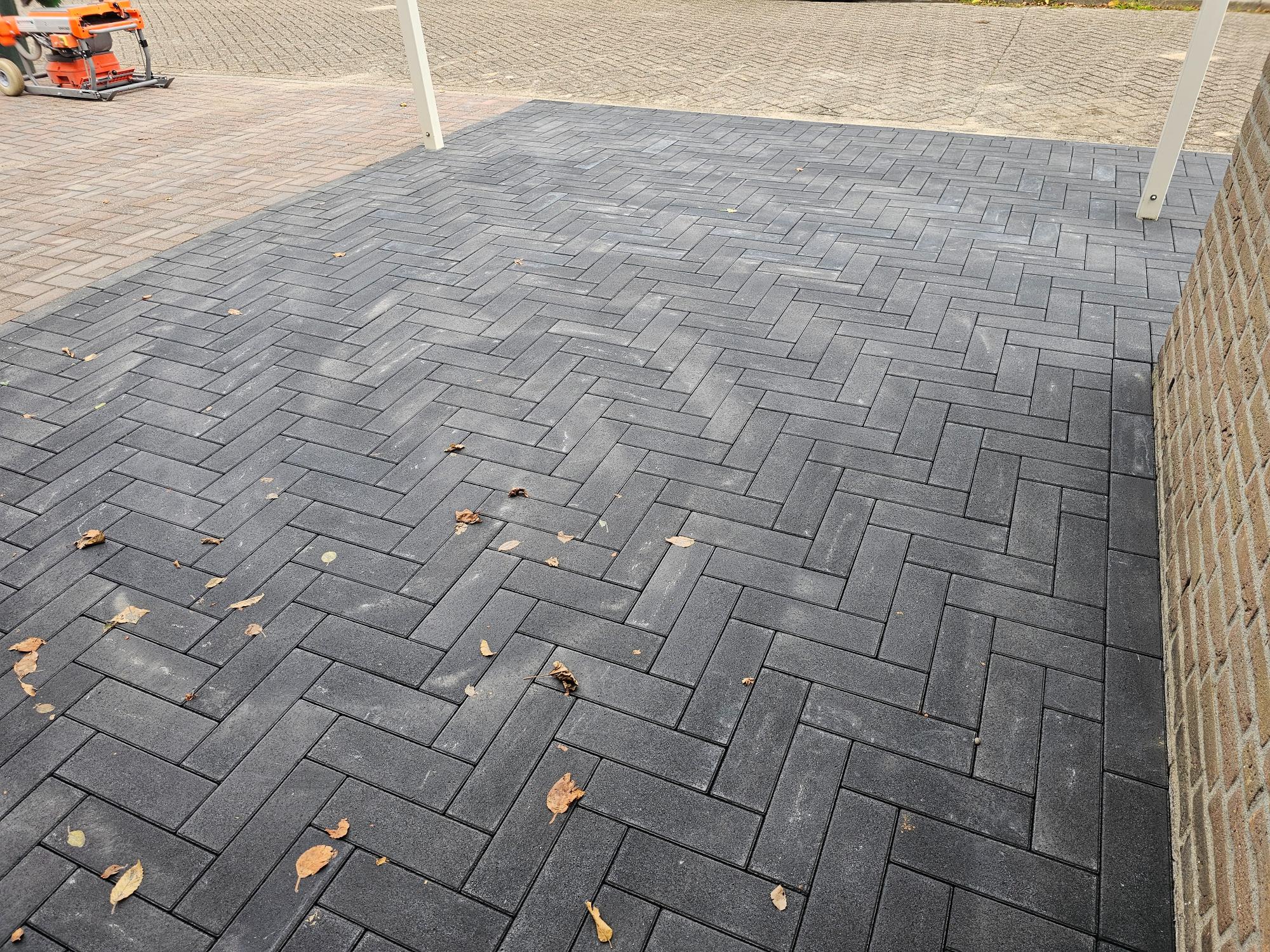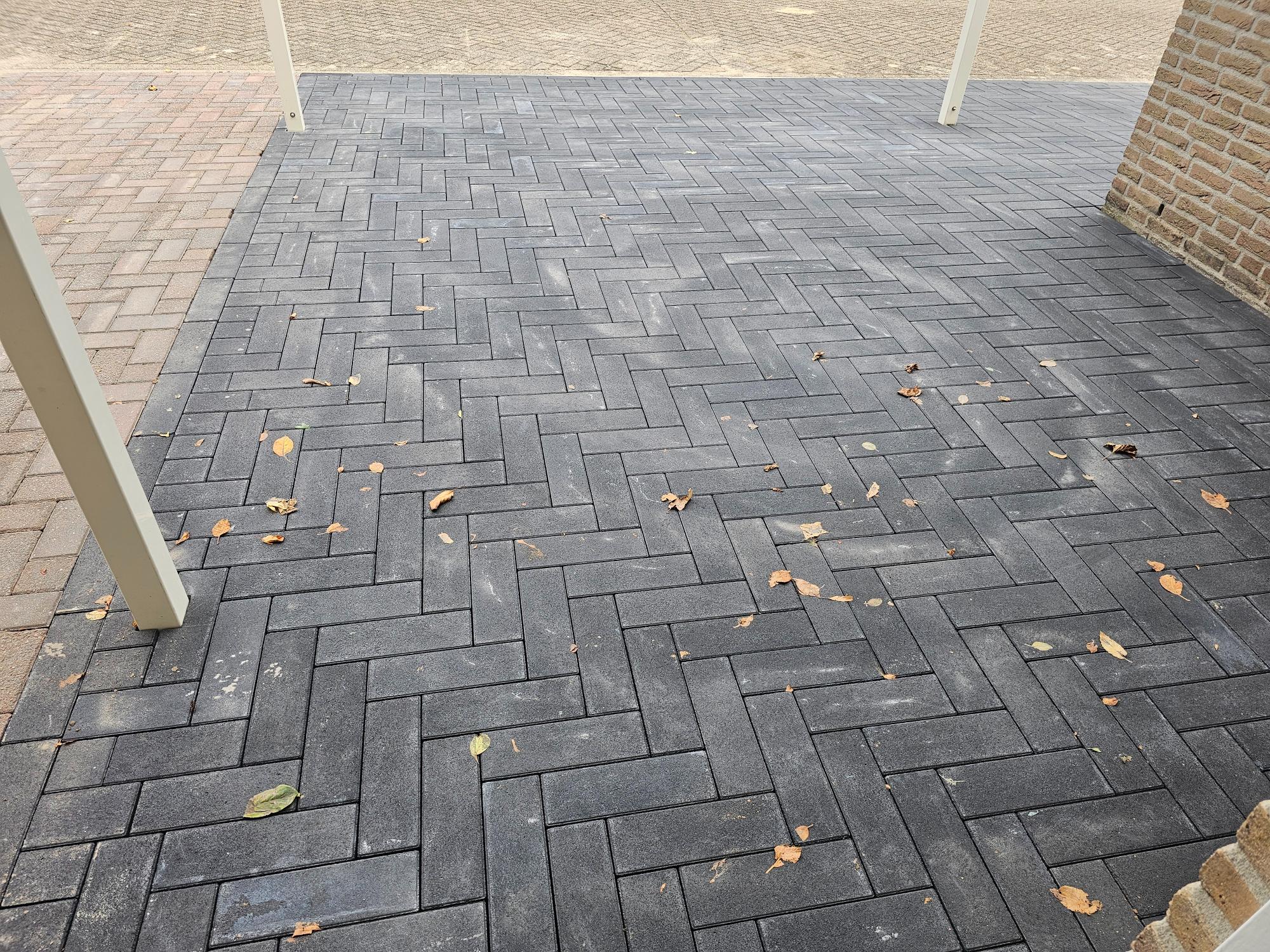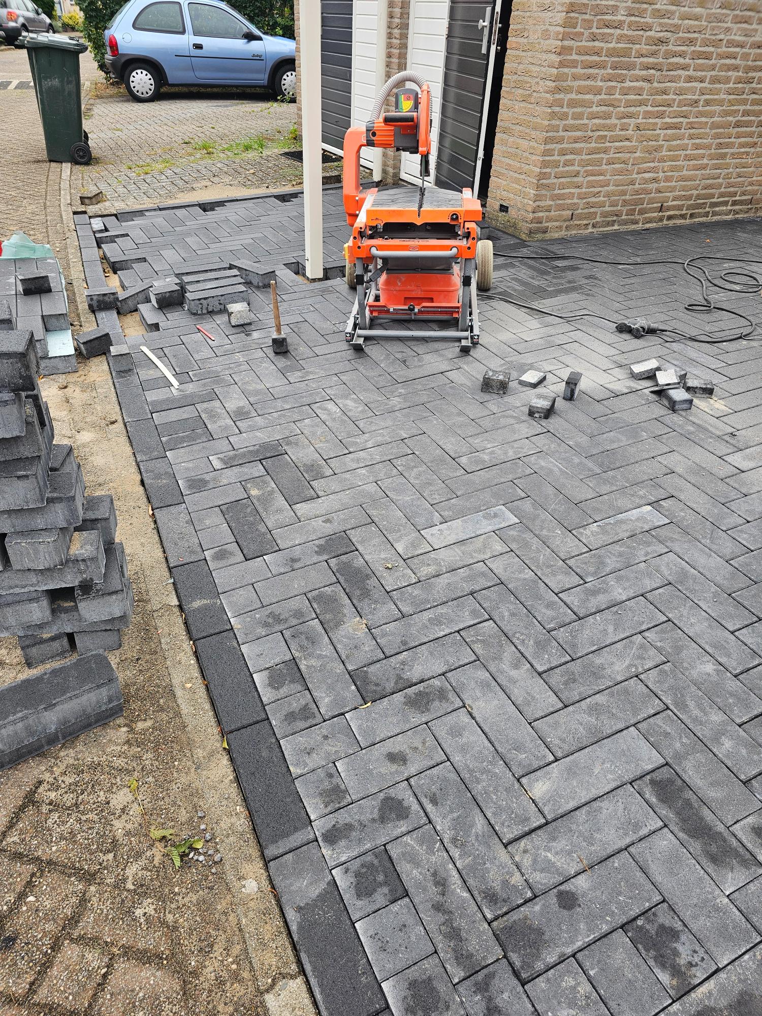 Omdat zulke strakke betonklinkers niet mooi zijn om te knippen, hebben wij ervoor gekozen om ze te zagen om een mooi geheel te krijgen.