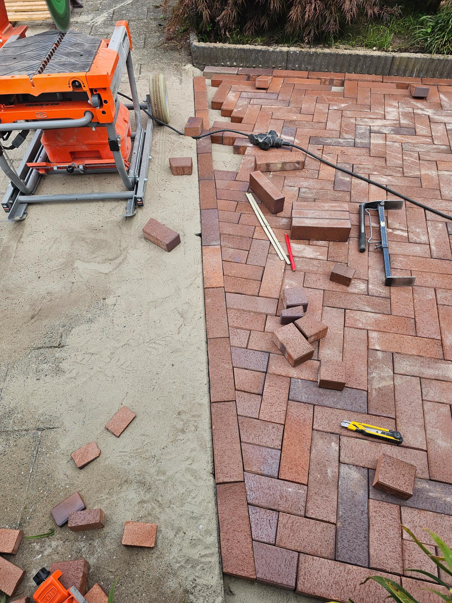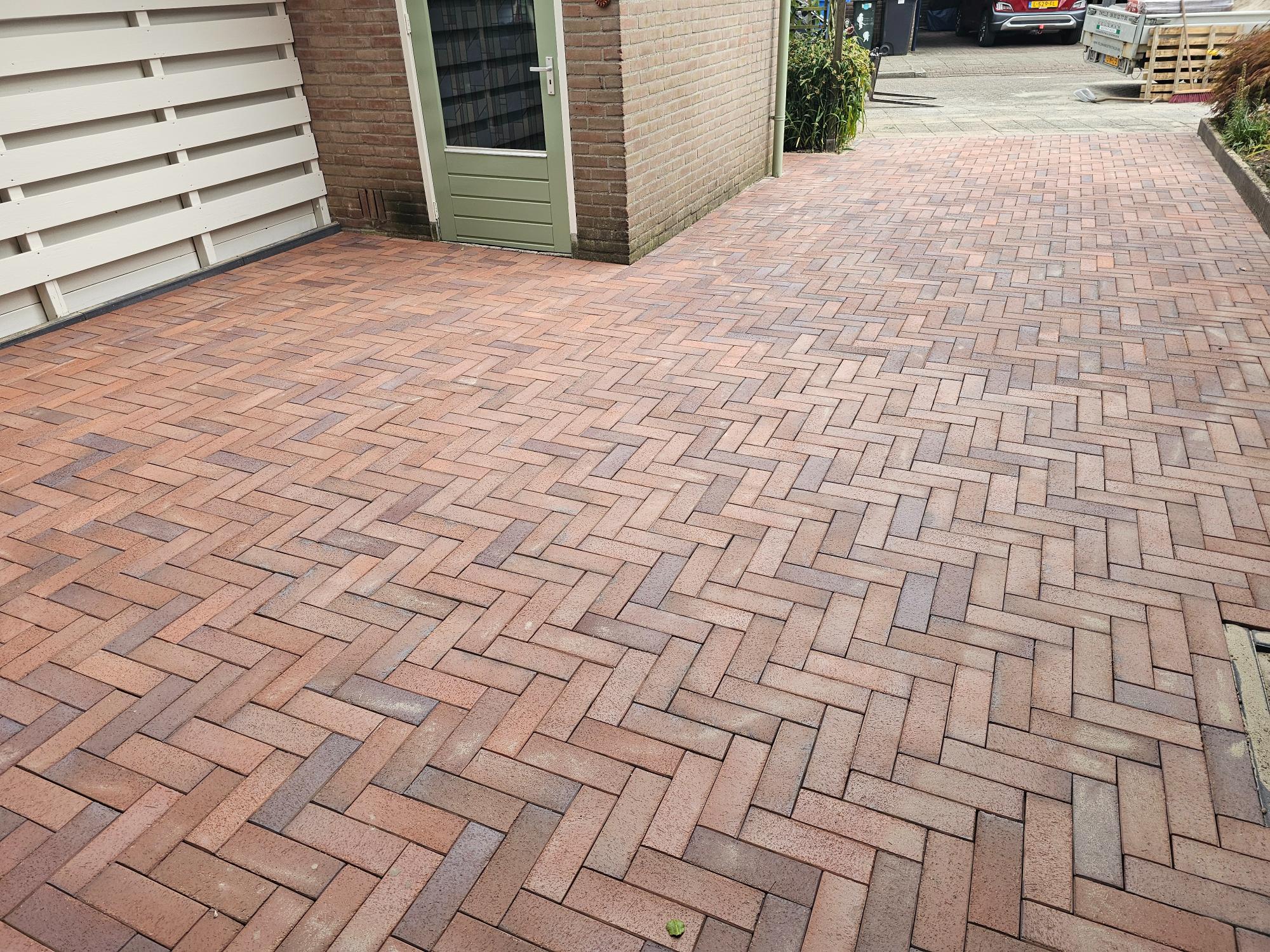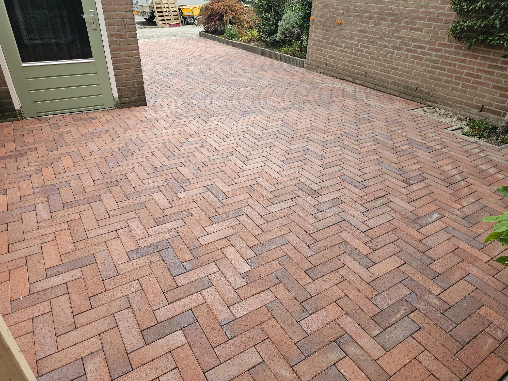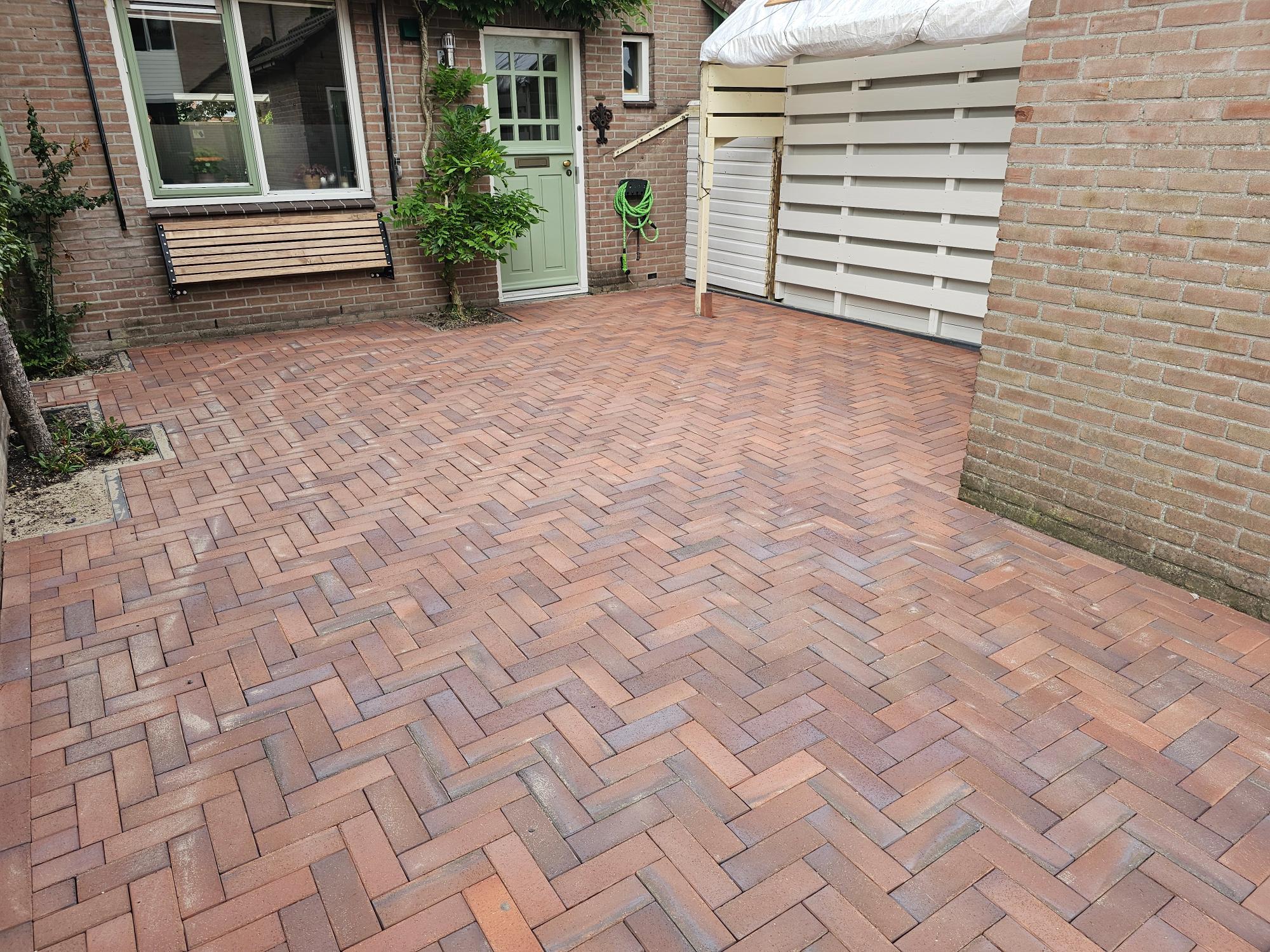 De gebakken dikformaten zijn gelegd in elleboogverband. Voor een mooi en strak geheel hebben wij de gebakken dikformaten gezaagd.