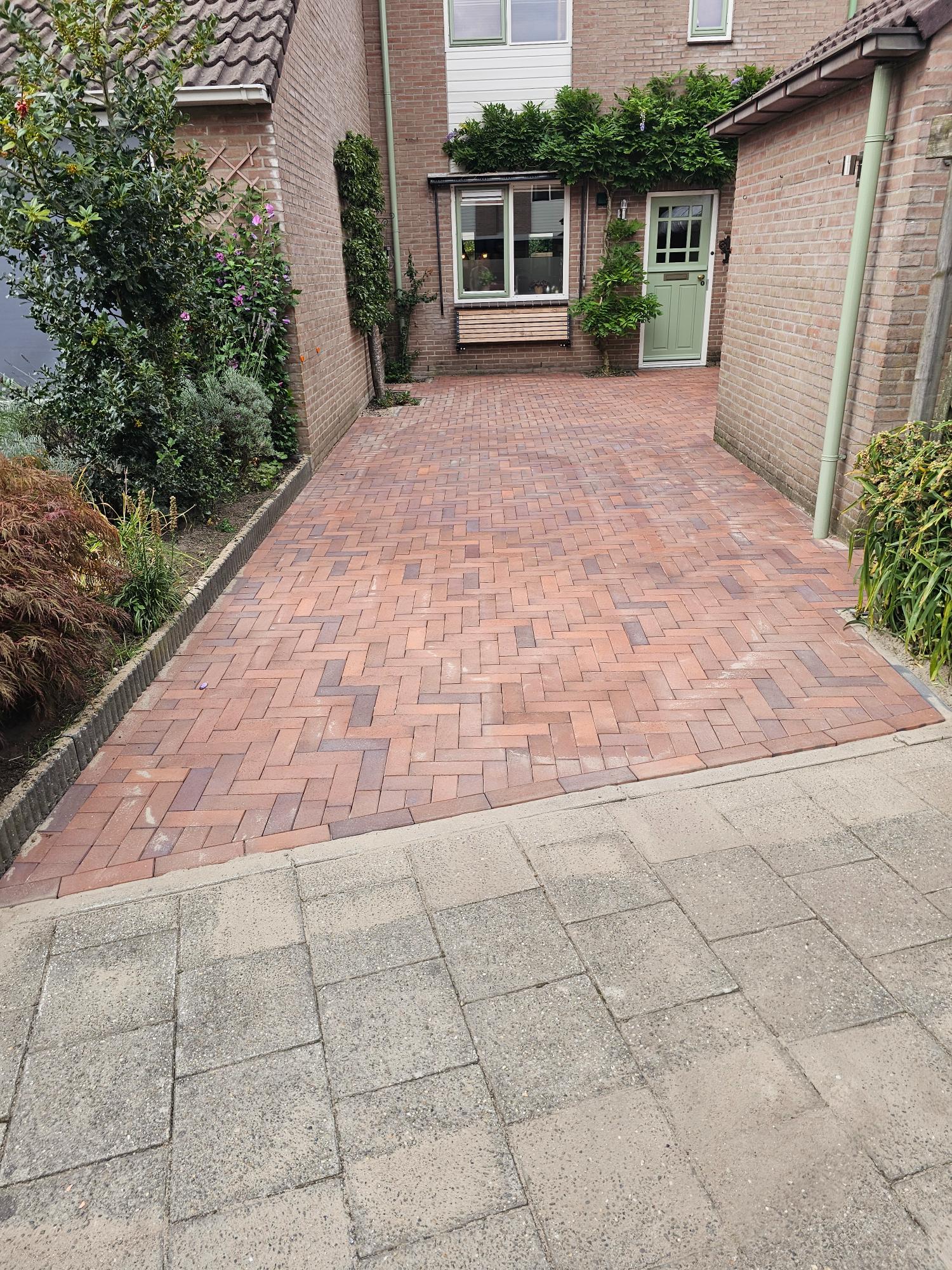 Bij deze woning hebben wij de oude betontegels uit de oprit verwijderd en afgevoerd. Omdat de oude oprit behoorlijk verzakt was, hebben wij zand aangevoerd en verwerkt tot de juiste hoogte, nadat wij deze verdicht hadden met onze zware trilplaat.