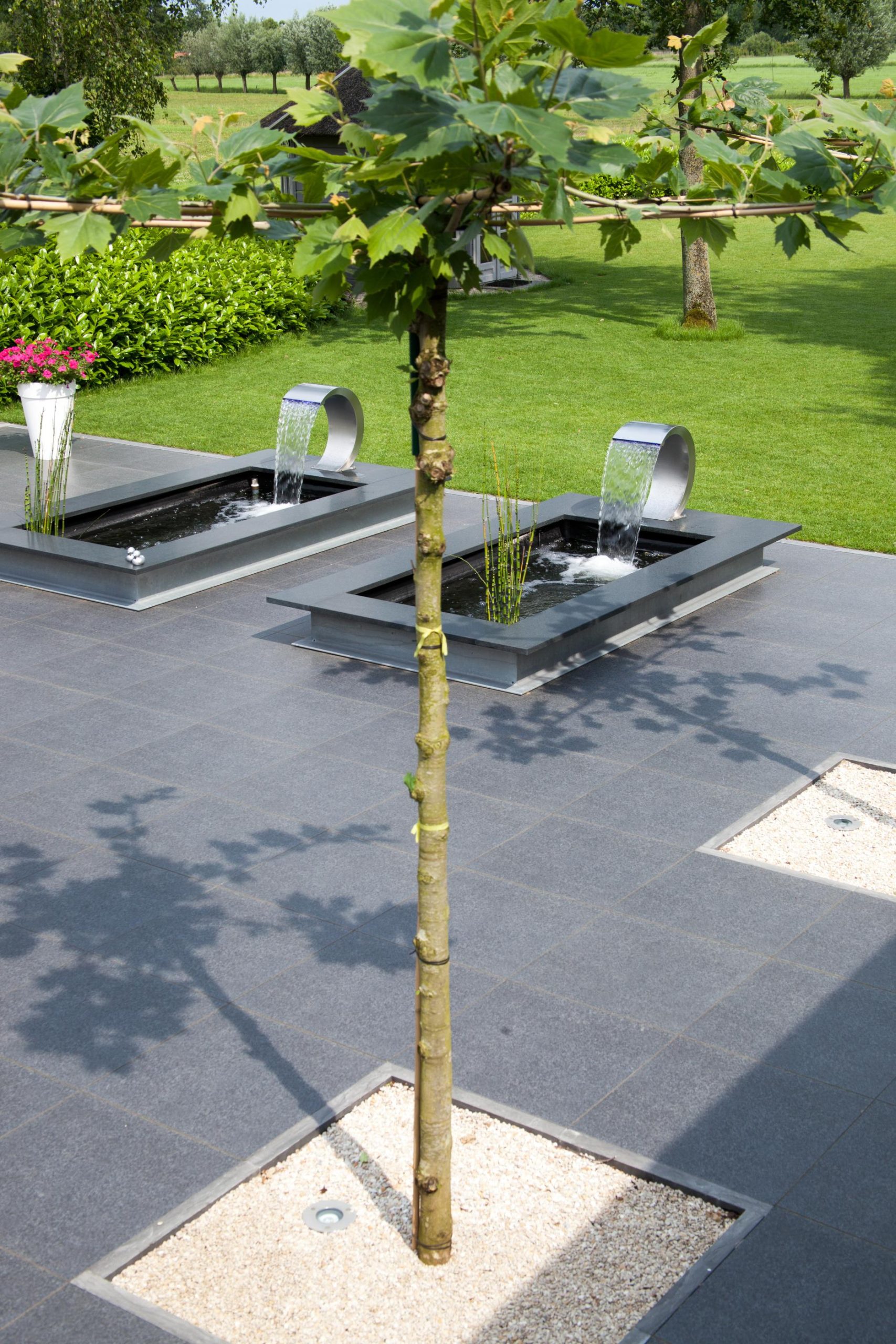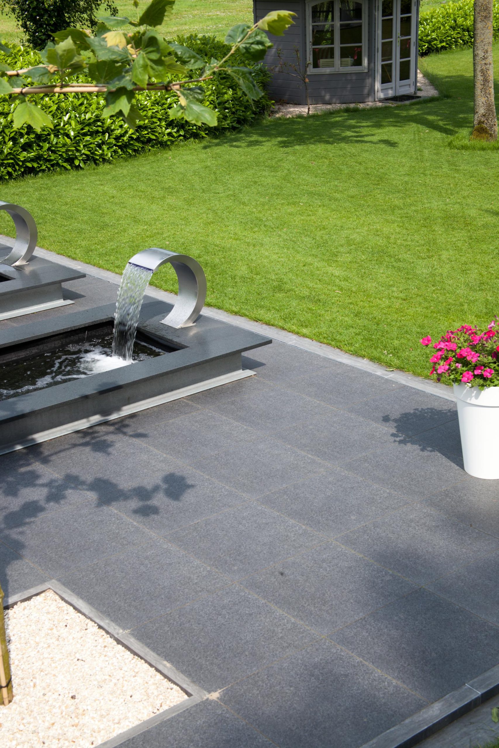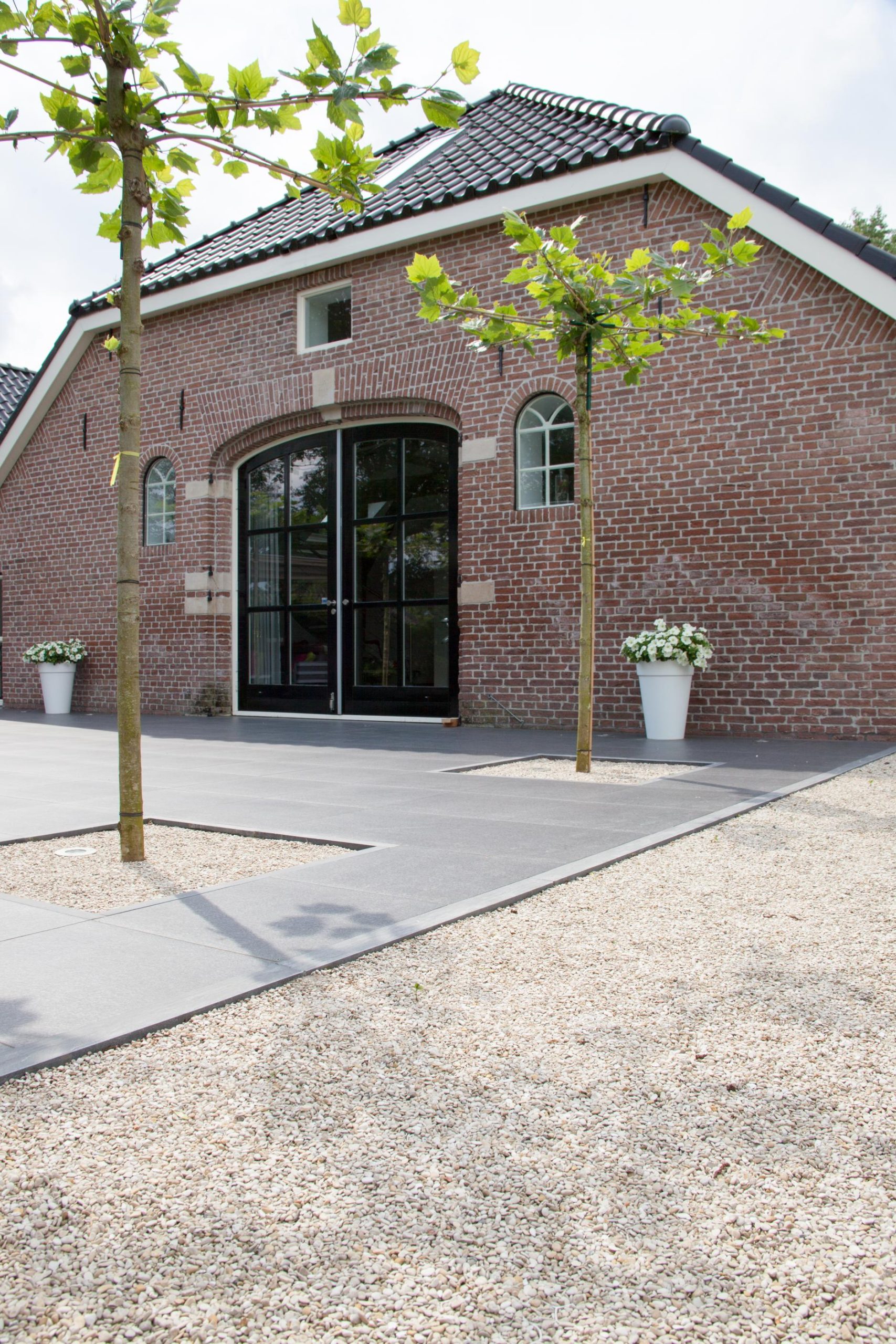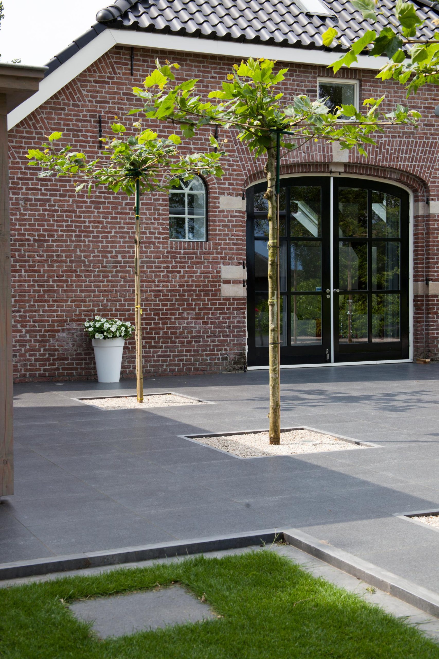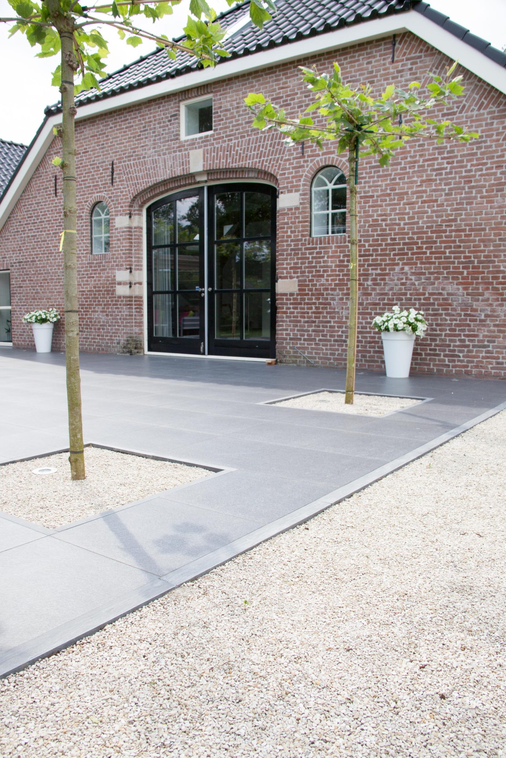 Deze tuin in Schelle hebben wij voorzien van 120 m² keramische tegels 60 x 60 cm. Deze hebben wij in Stabisplit gelegd en daarna gevoegd. In de vakken onder de bomen en aan de rand van het terras hebben wij split aangebracht.
