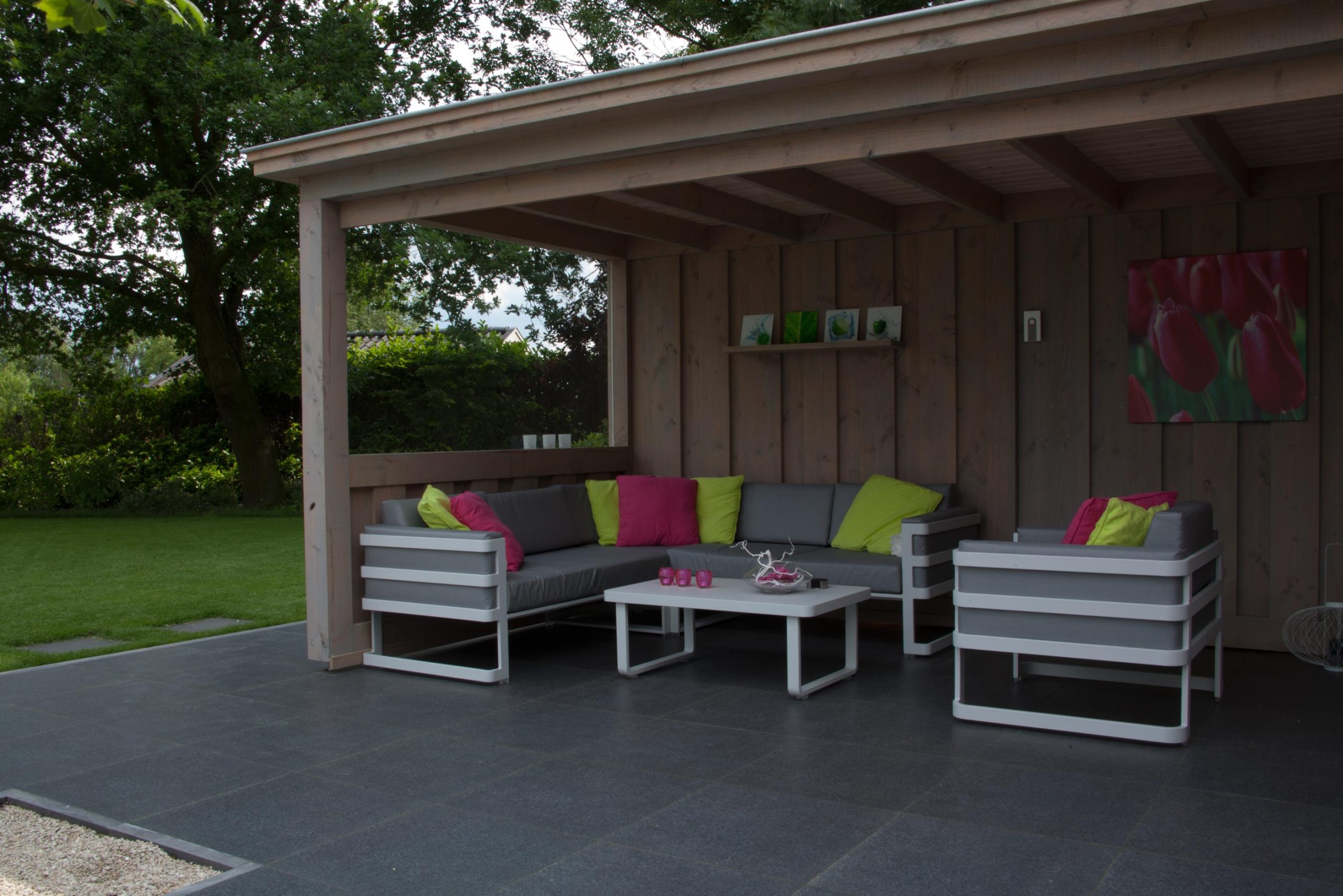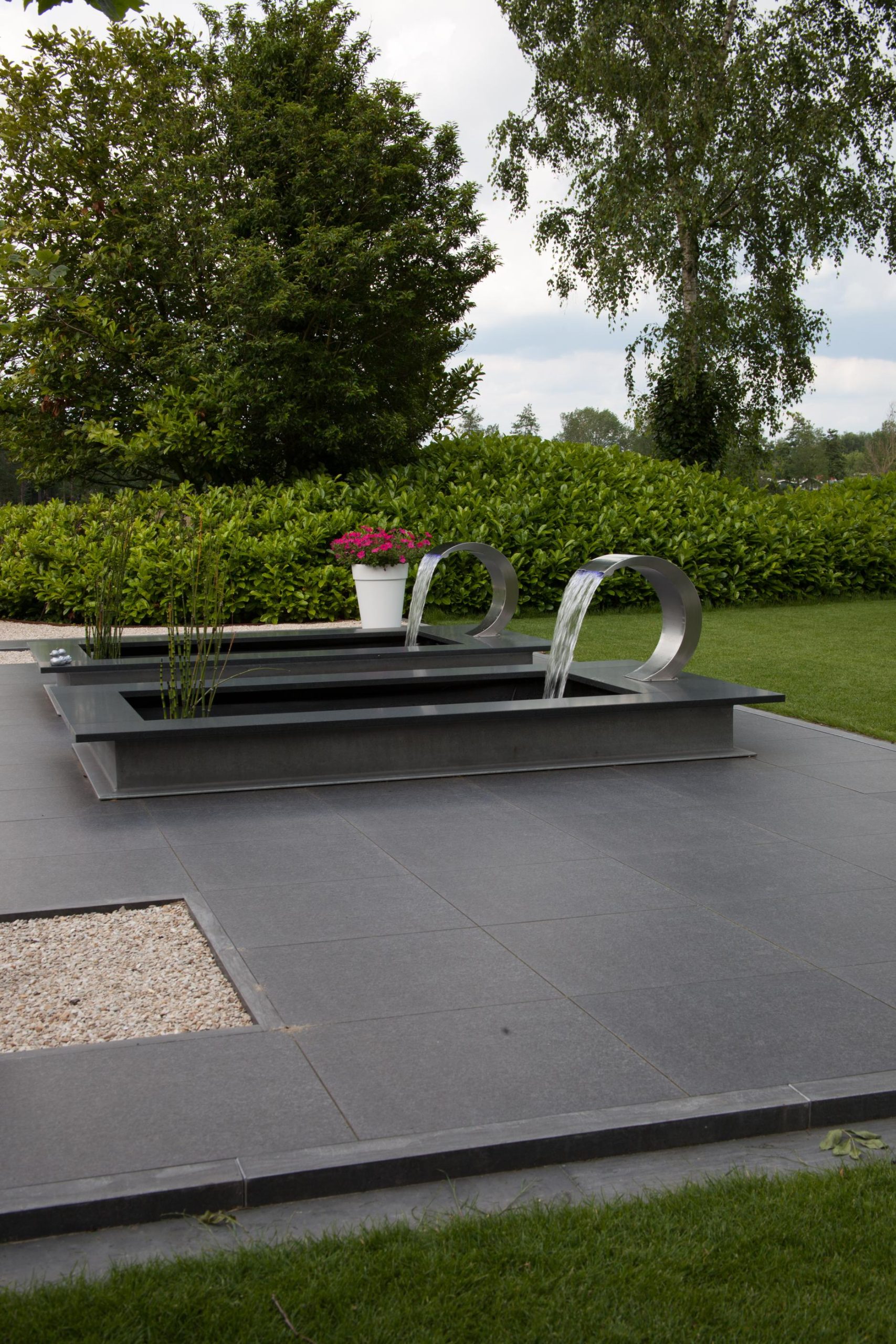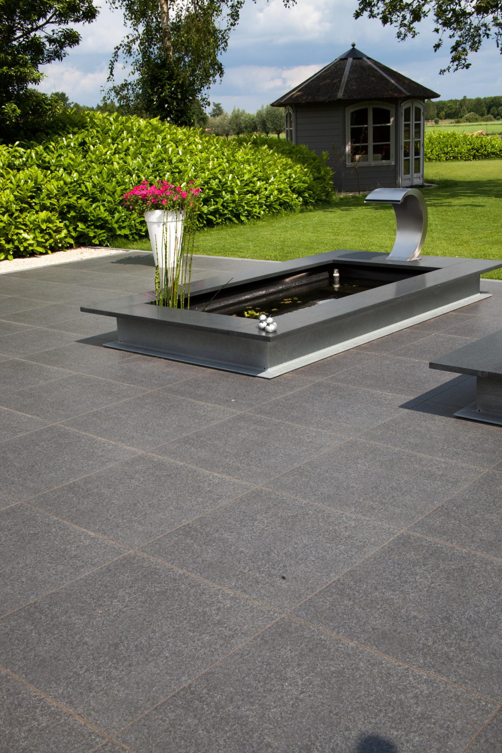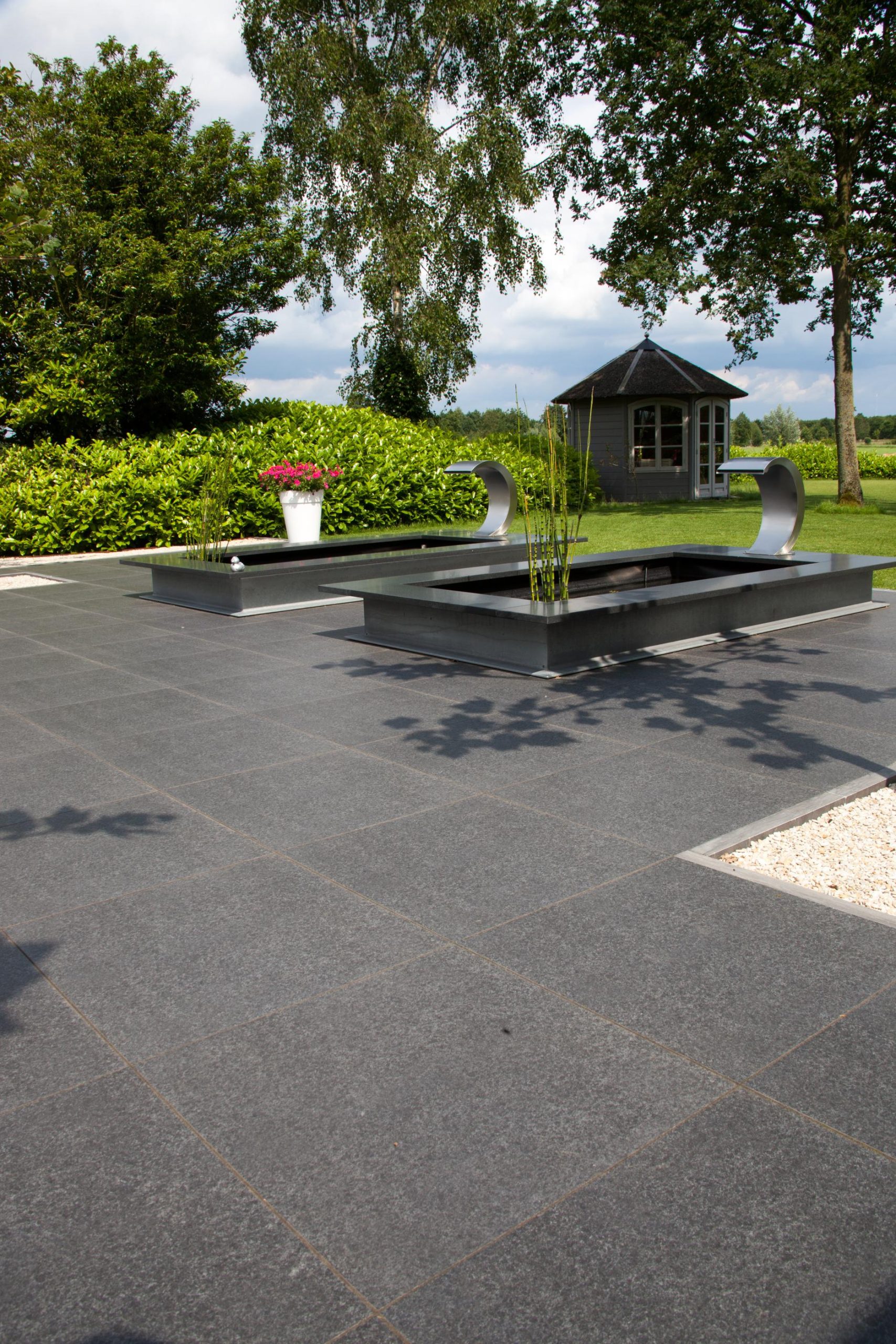 Deze tuin in Schelle hebben wij voorzien van 120 m² keramische tegels 60 x 60 cm. Deze hebben wij in Stabisplit gelegd en daarna gevoegd. In de vakken onder de bomen en aan de rand van het terras hebben wij split aangebracht.