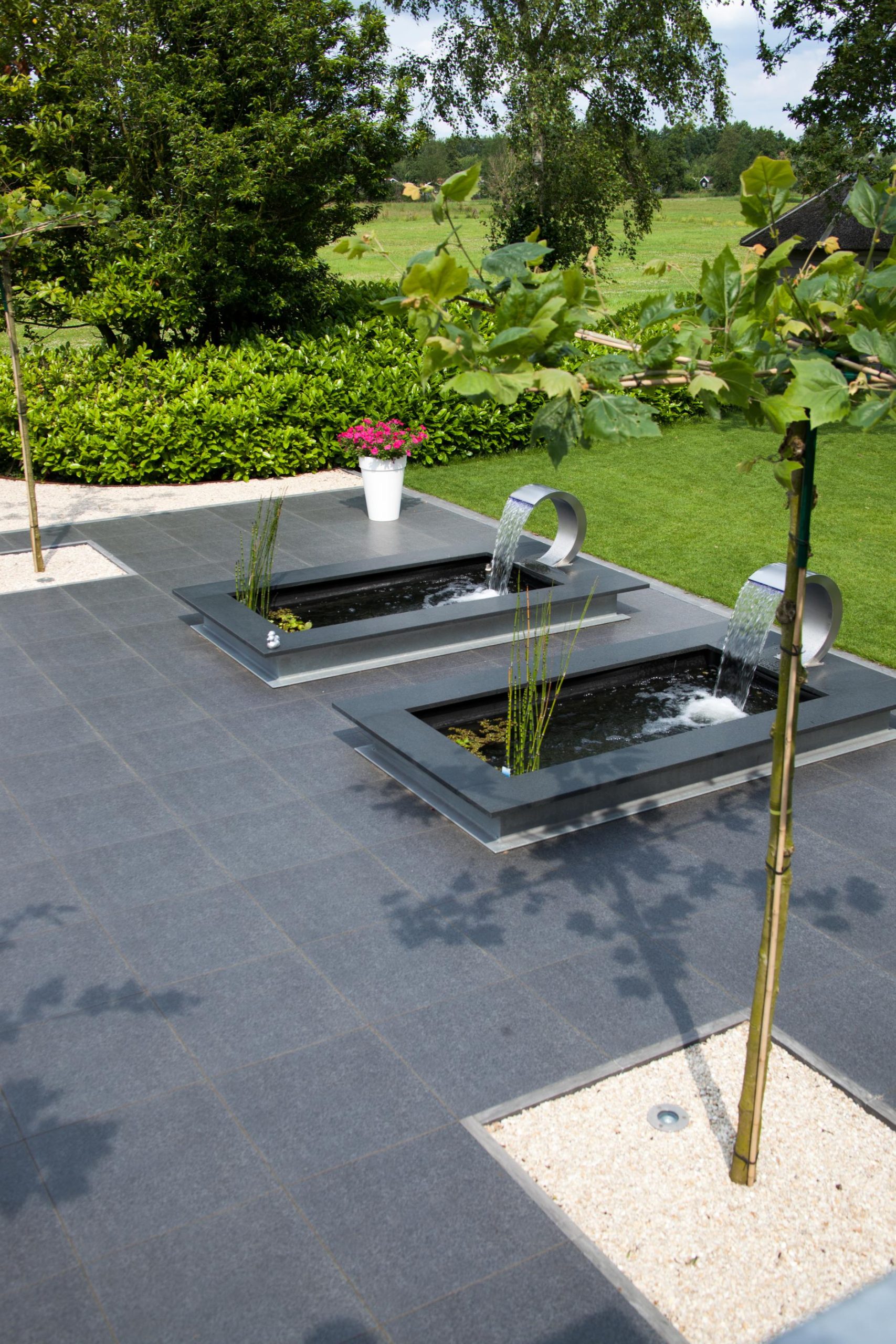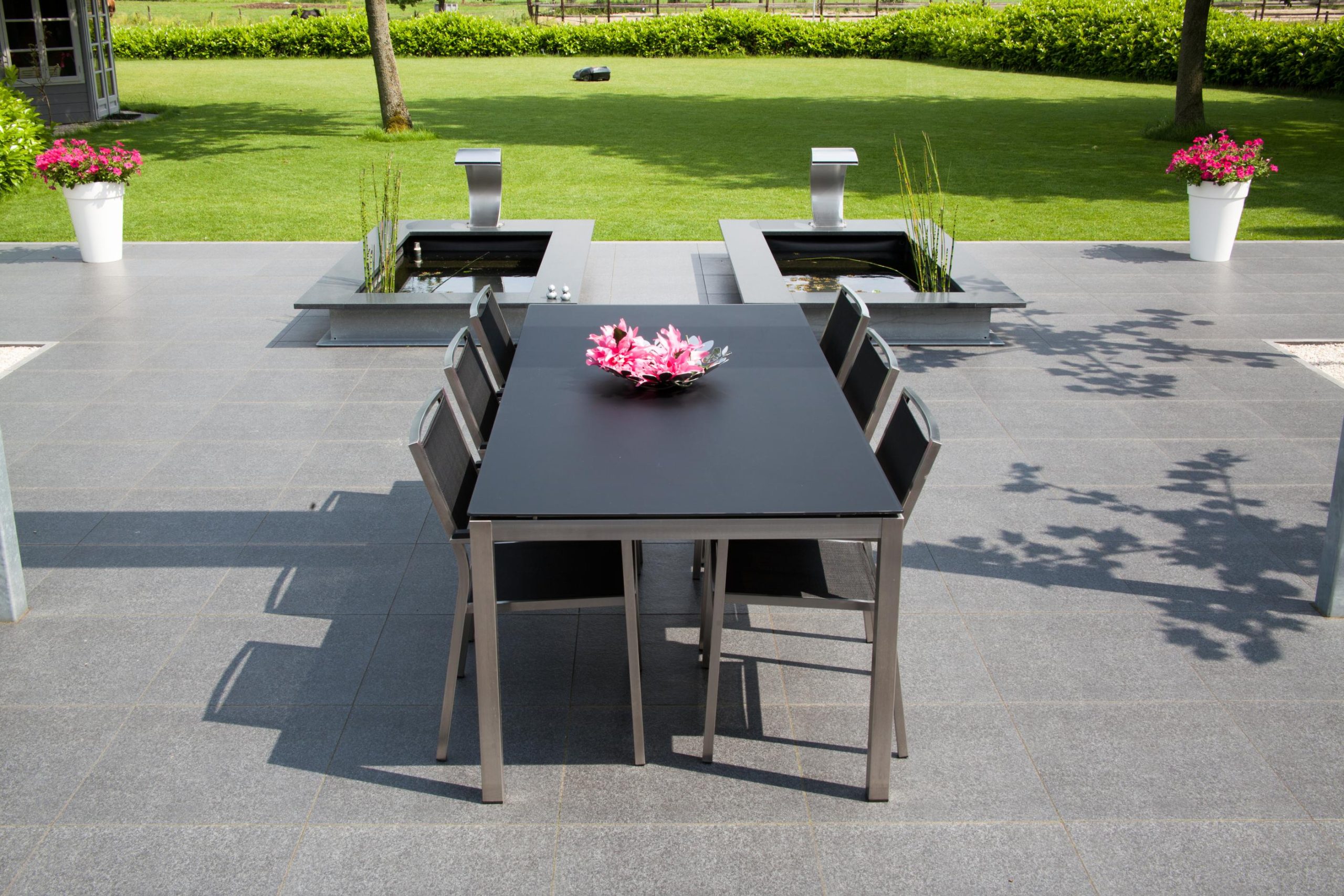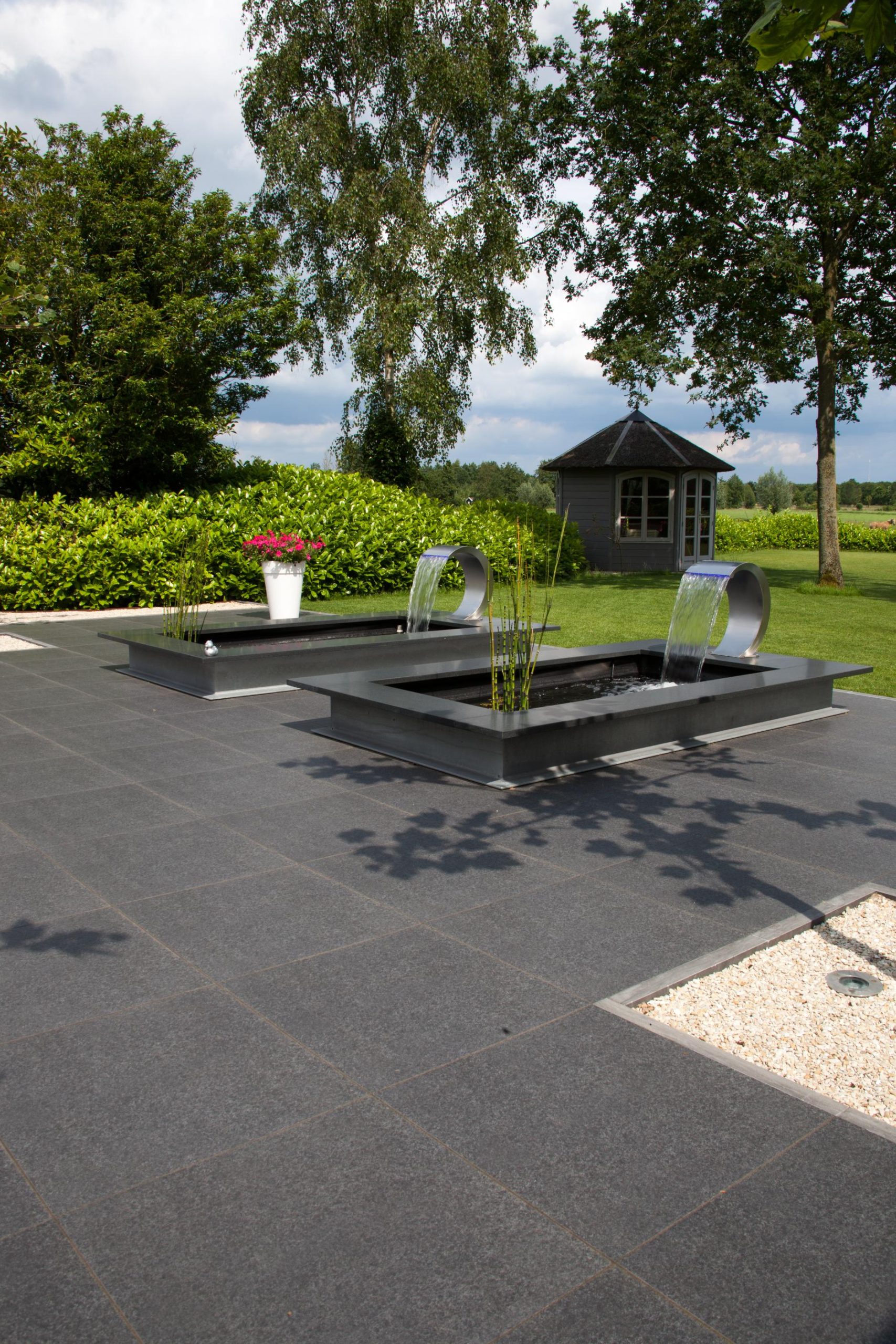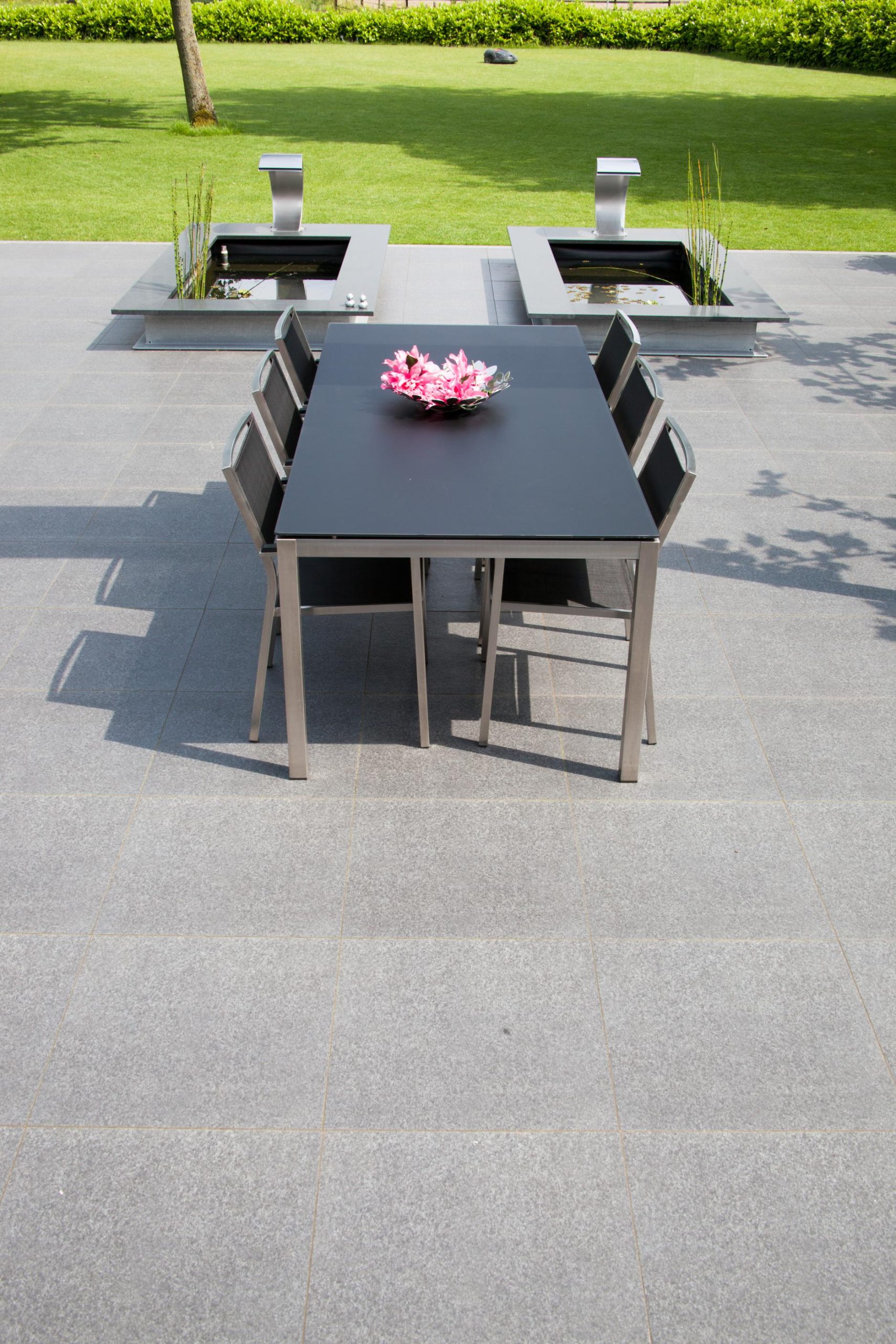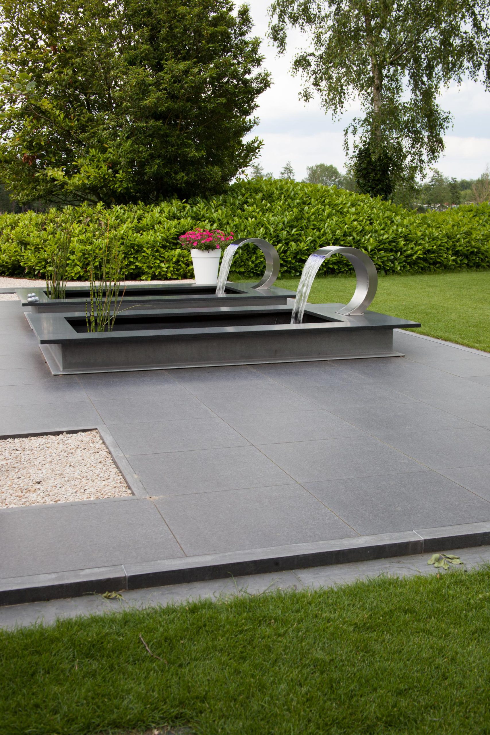 Deze tuin in Schelle hebben wij voorzien van 120 m² keramische tegels 60 x 60 cm. Deze hebben wij in Stabisplit gelegd en daarna gevoegd. In de vakken onder de bomen en aan de rand van het terras hebben wij split aangebracht.