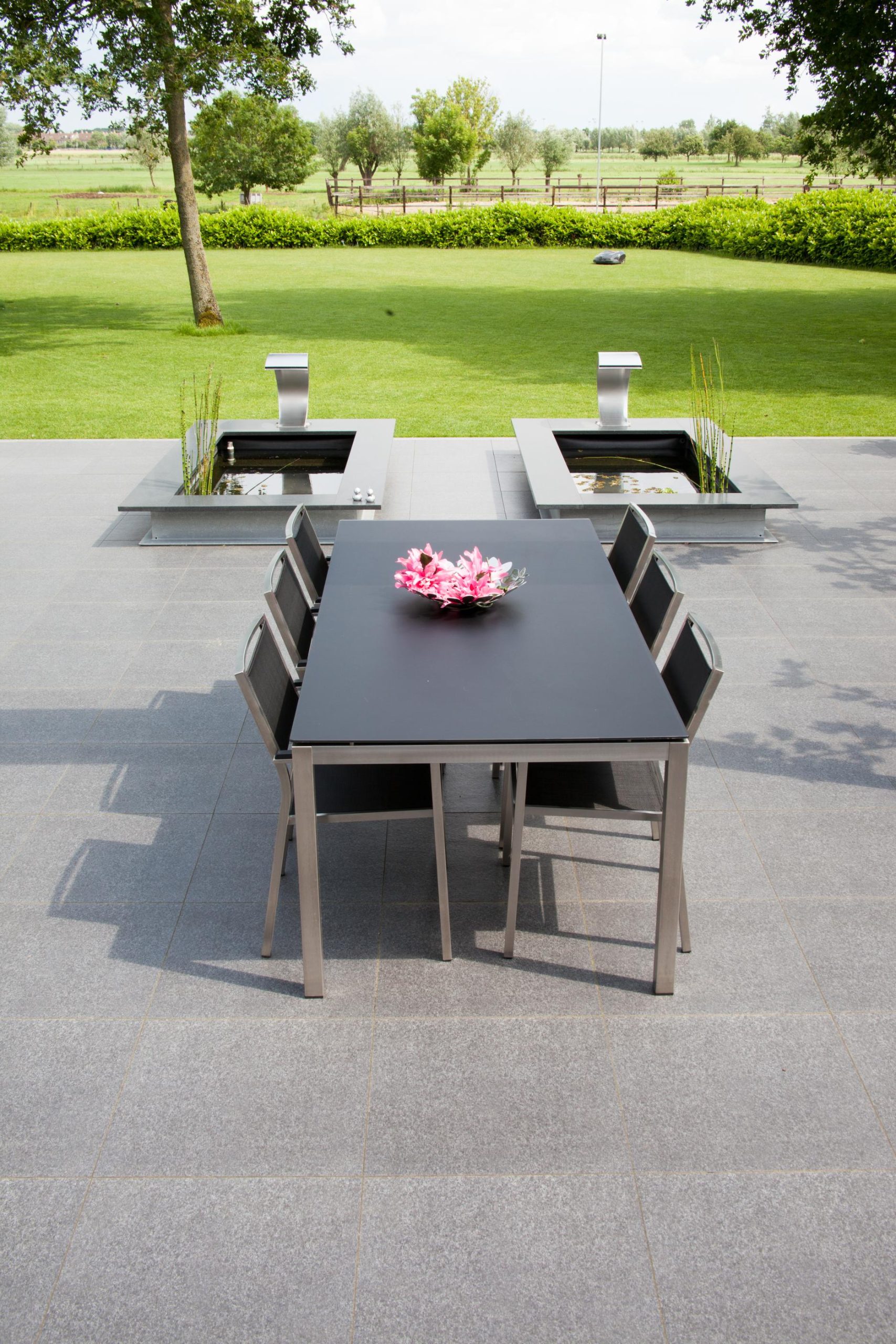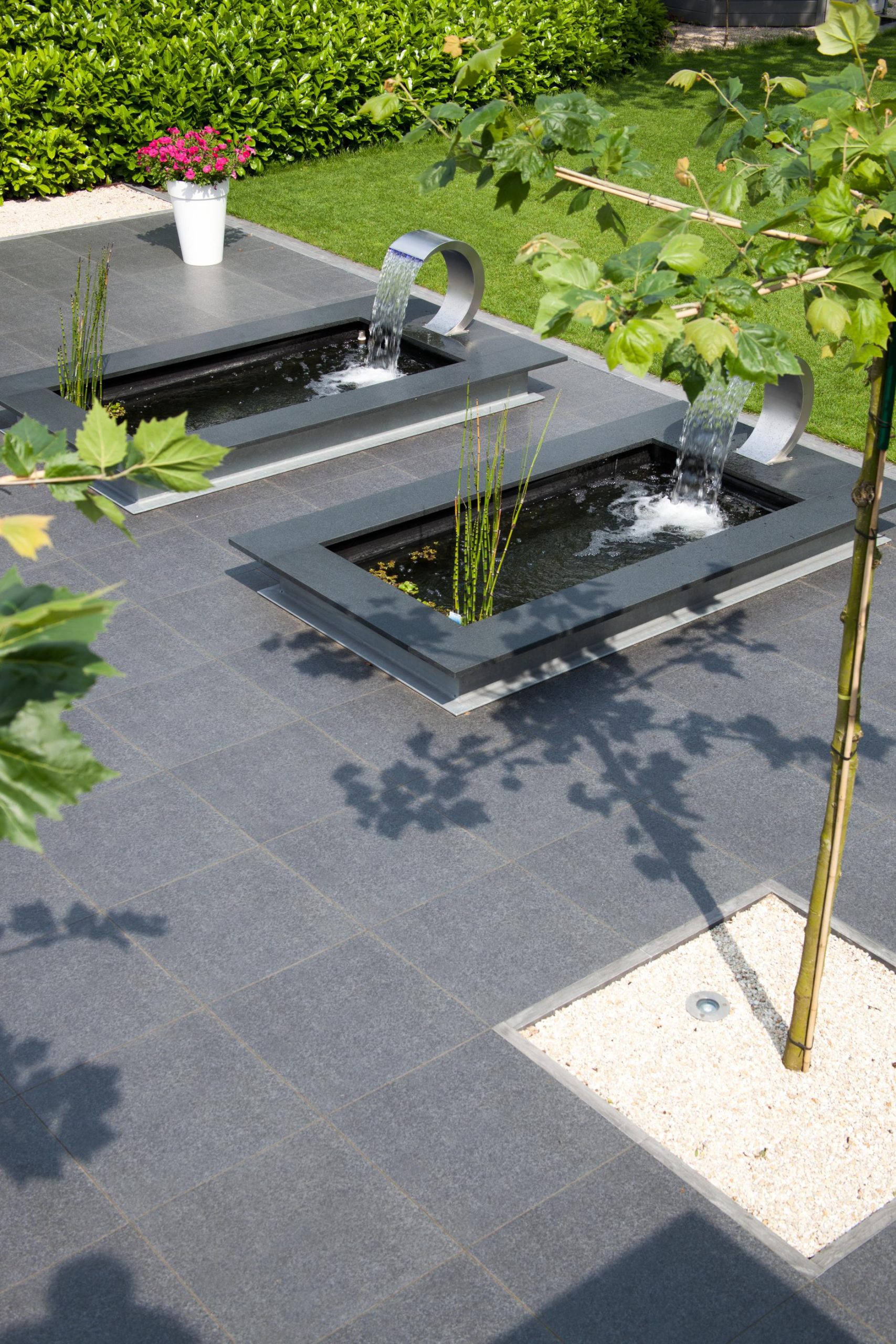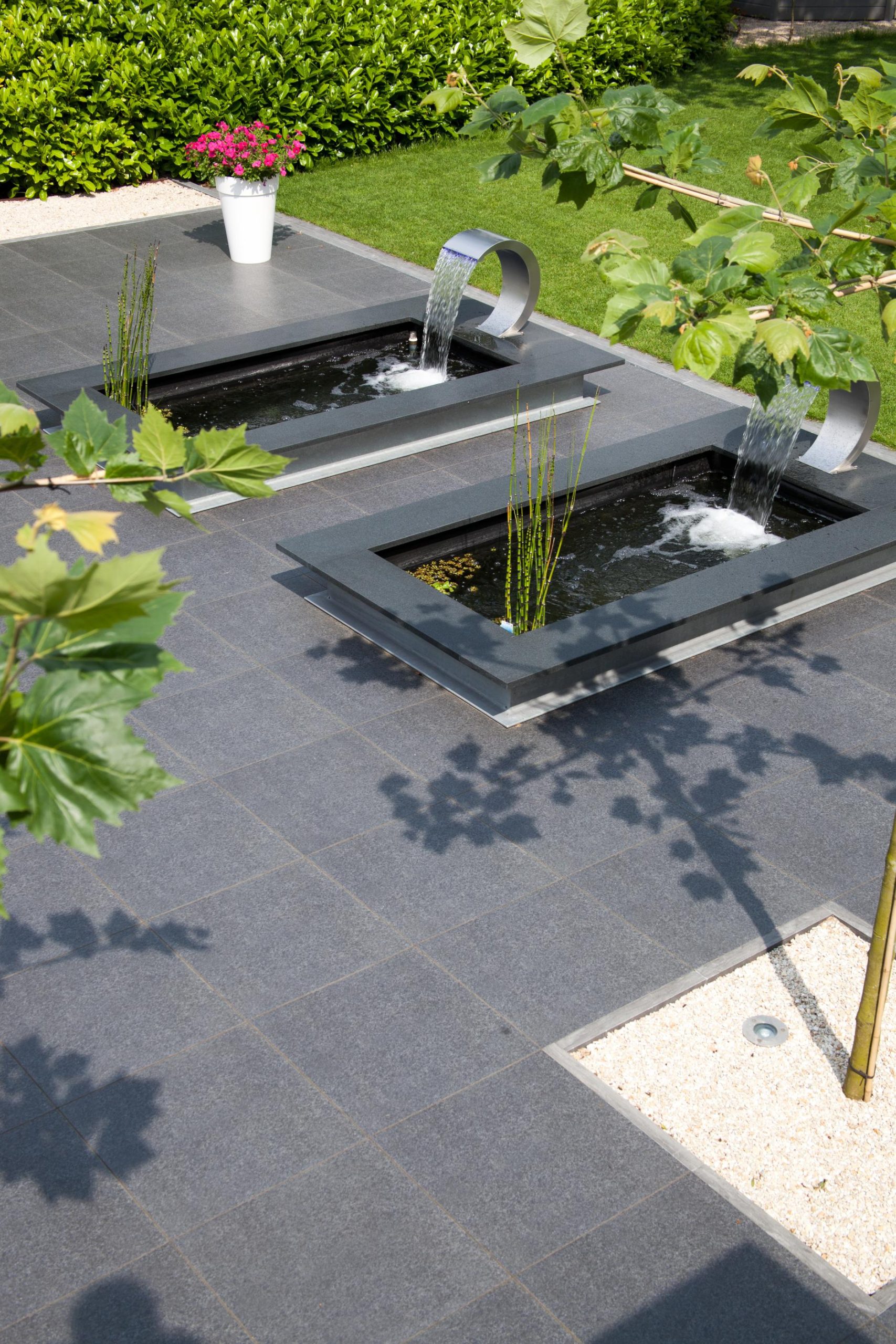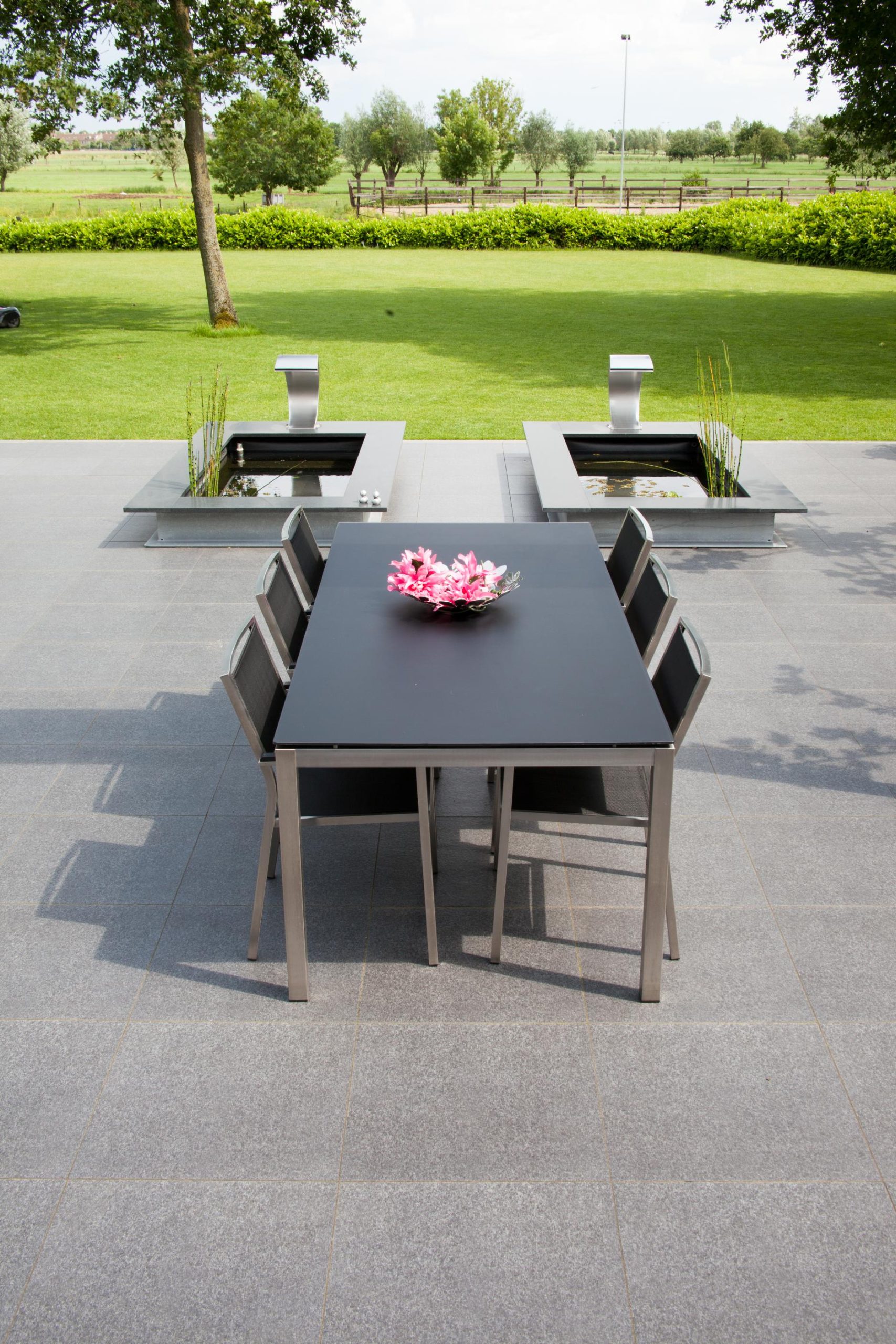 Deze tuin in Schelle hebben wij voorzien van 120 m² keramische tegels 60 x 60 cm. Deze hebben wij in Stabisplit gelegd en daarna gevoegd. In de vakken onder de bomen en aan de rand van het terras hebben wij split aangebracht.
