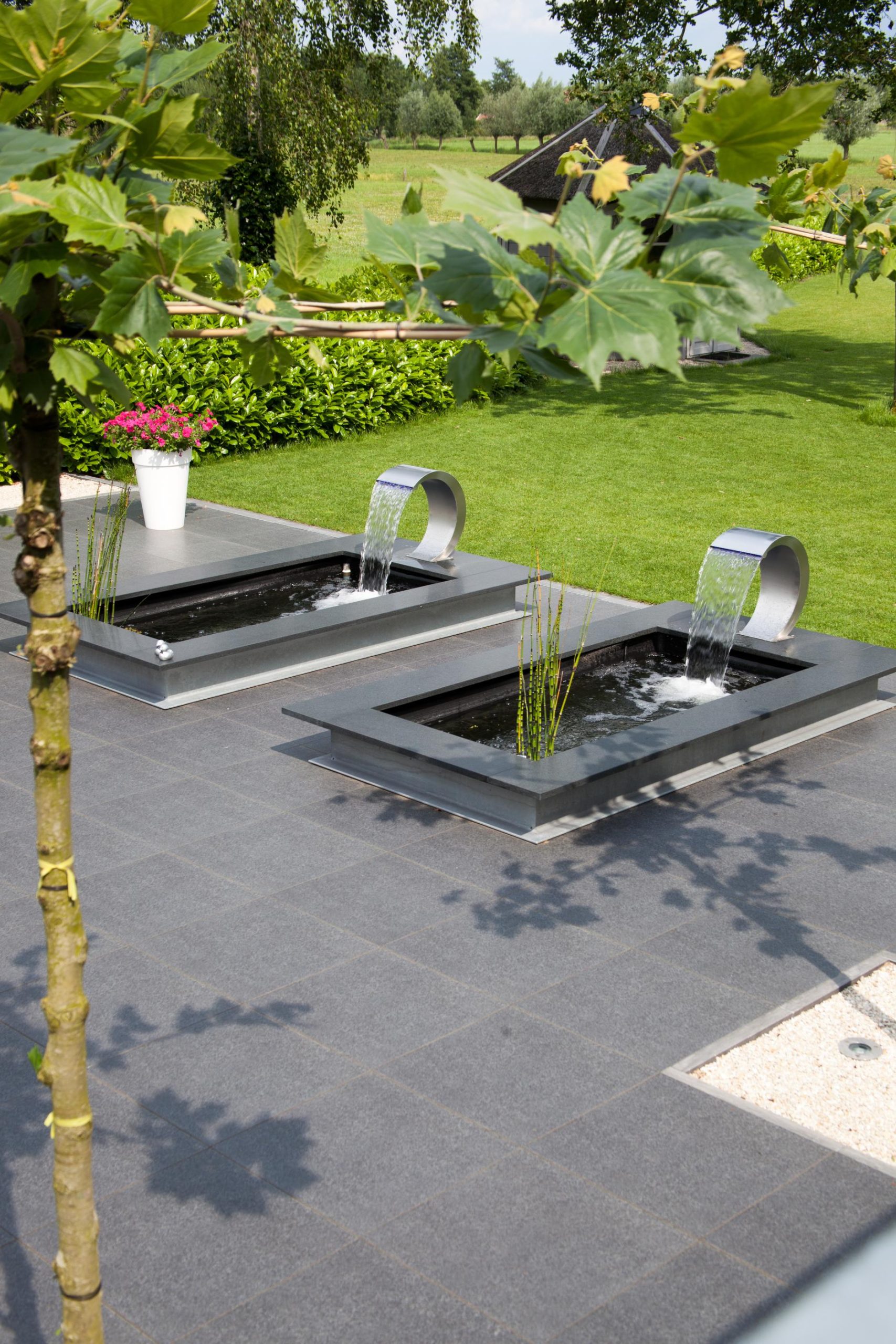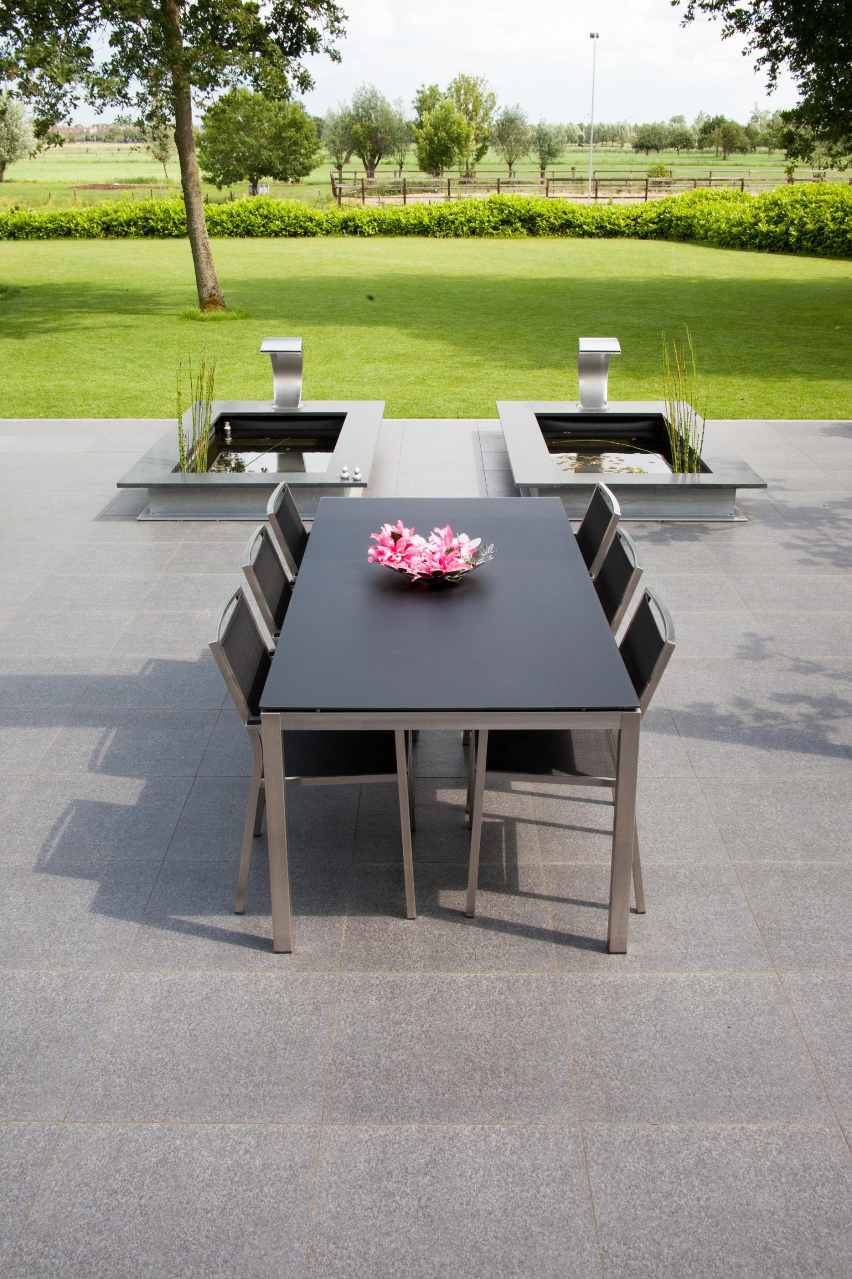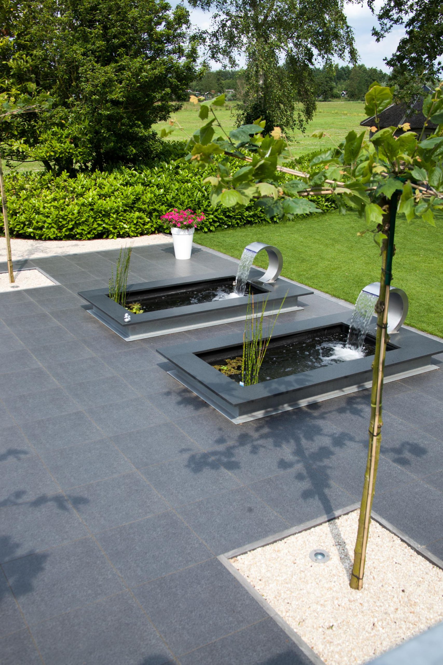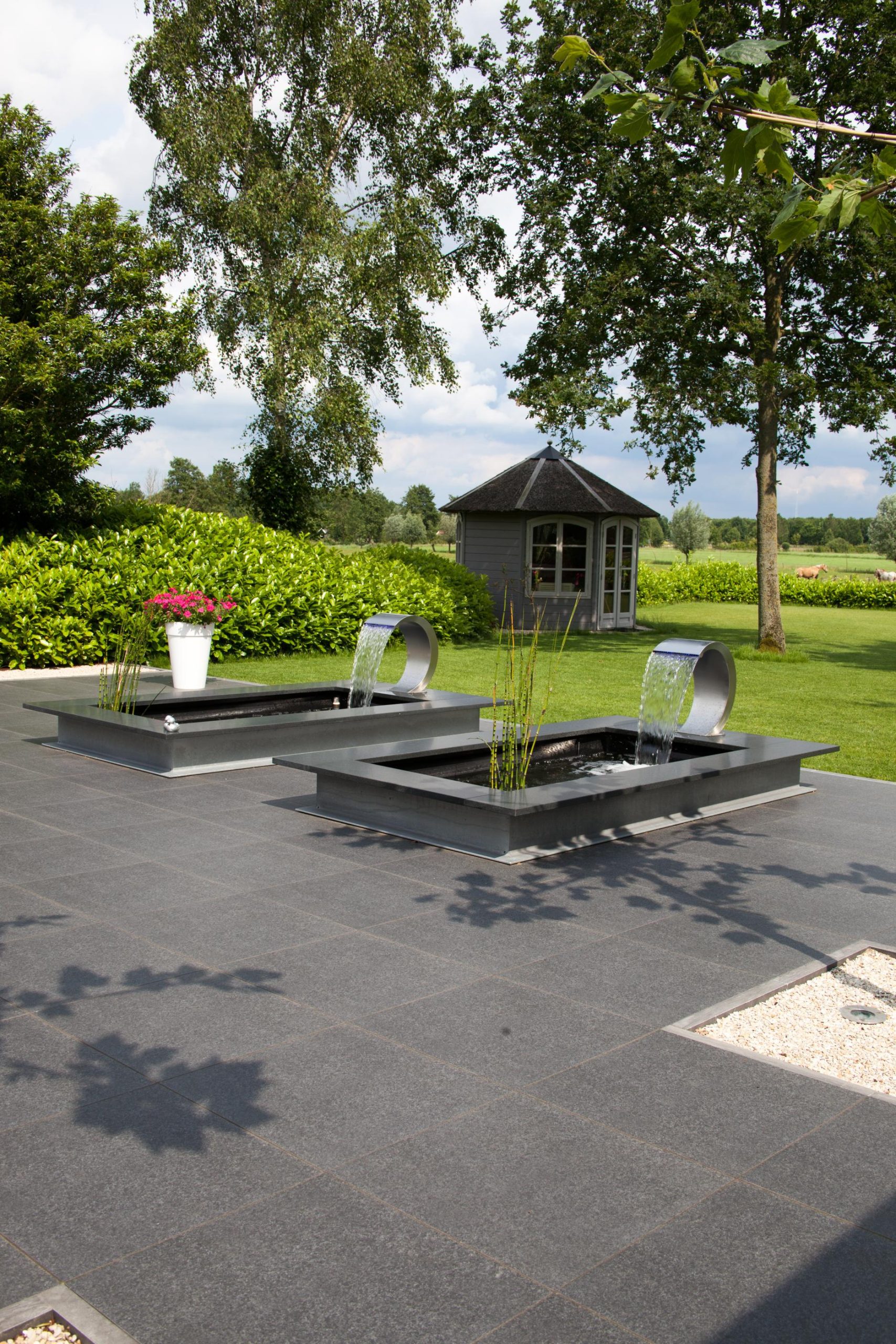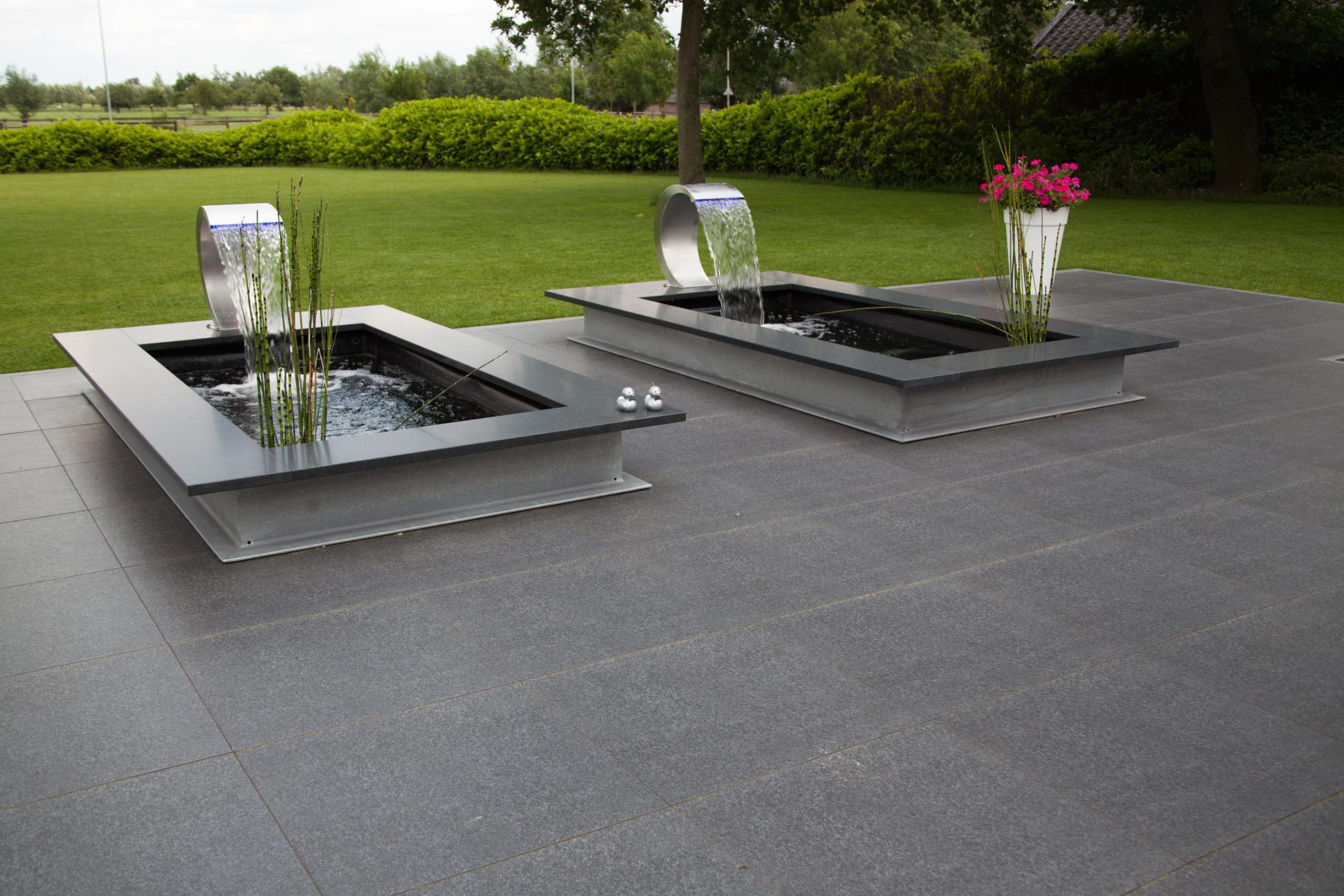 Deze tuin in Schelle hebben wij voorzien van 120 m² keramische tegels 60 x 60 cm. Deze hebben wij in Stabisplit gelegd en daarna gevoegd. In de vakken onder de bomen en aan de rand van het terras hebben wij split aangebracht.