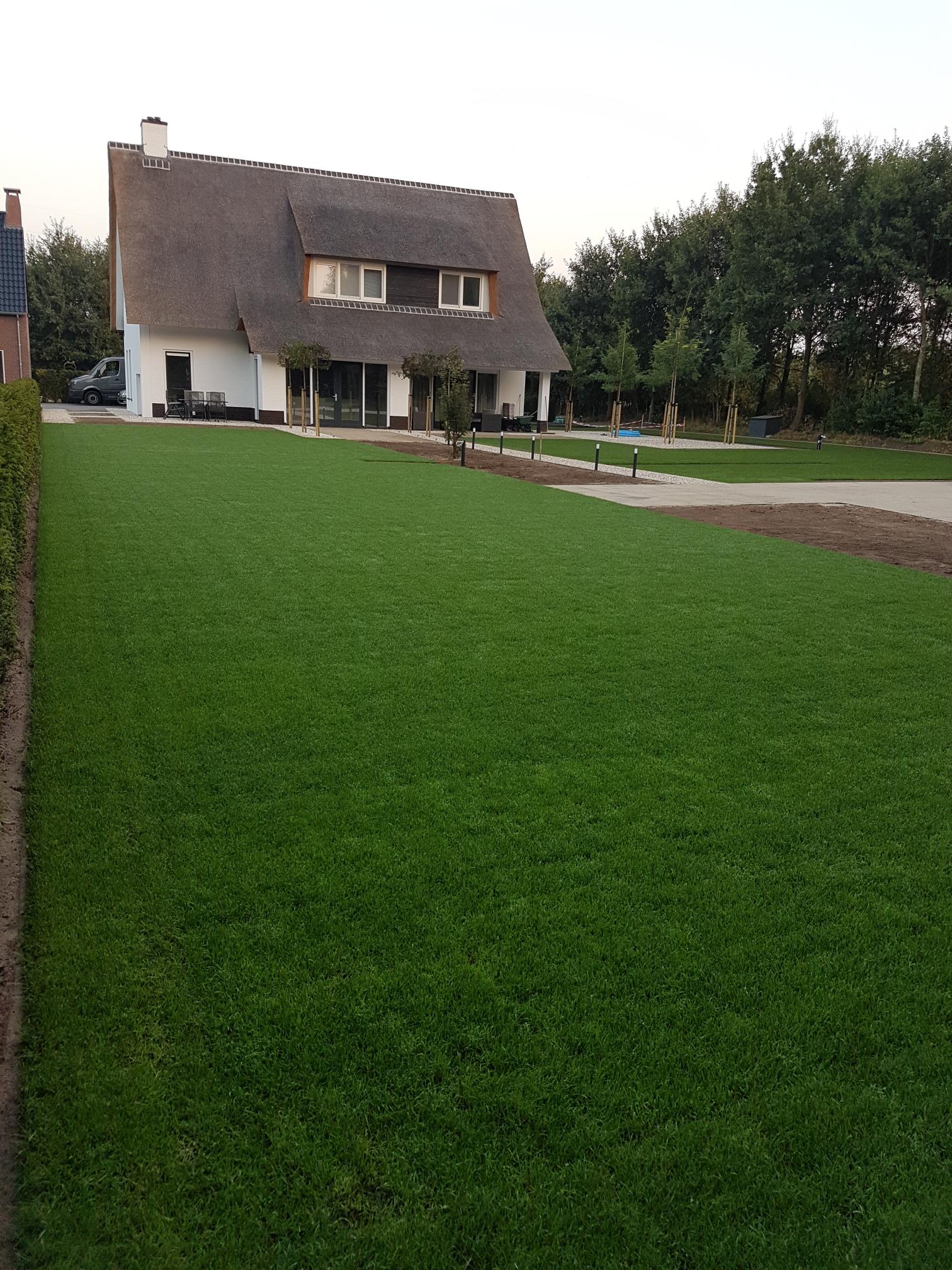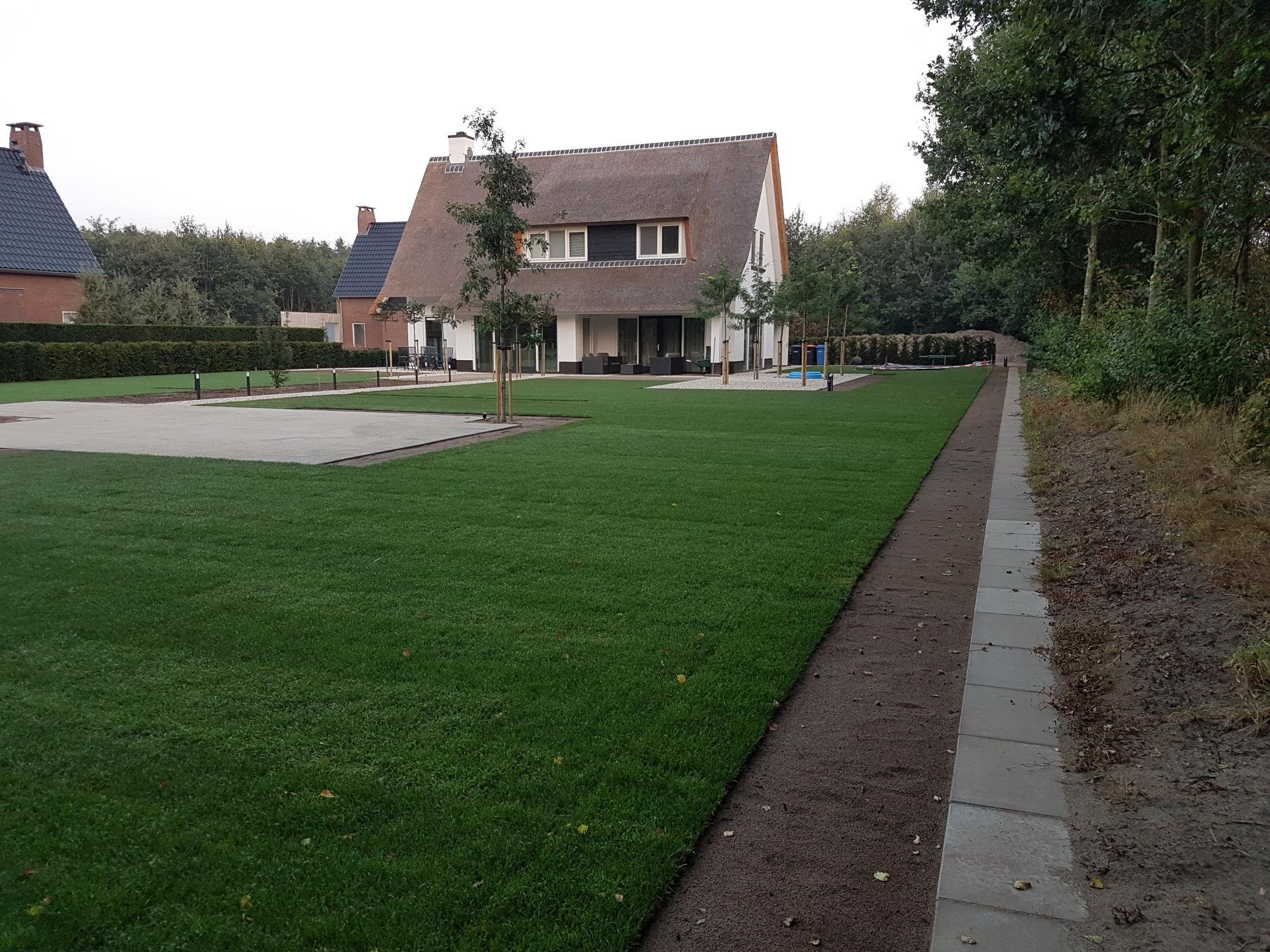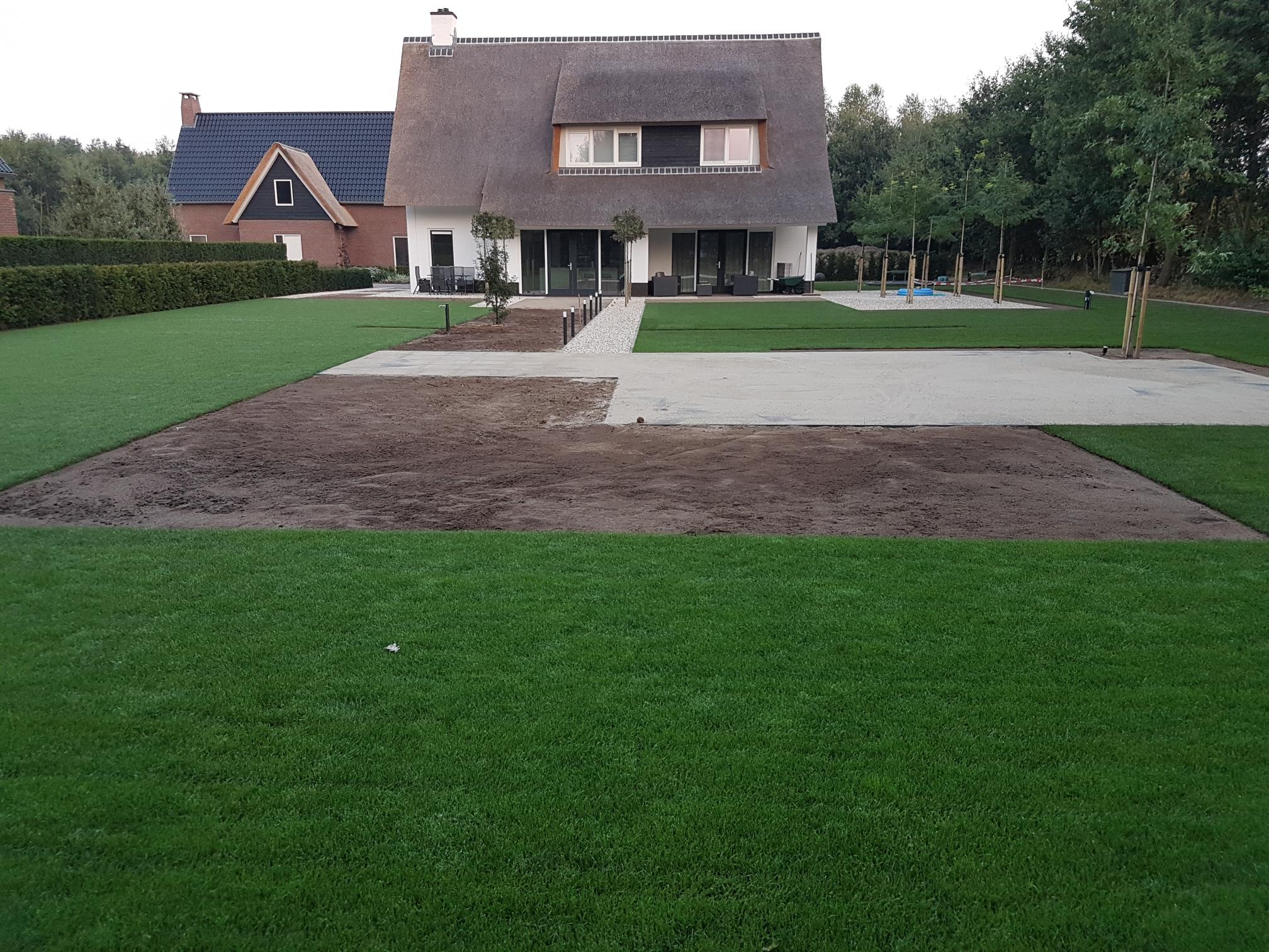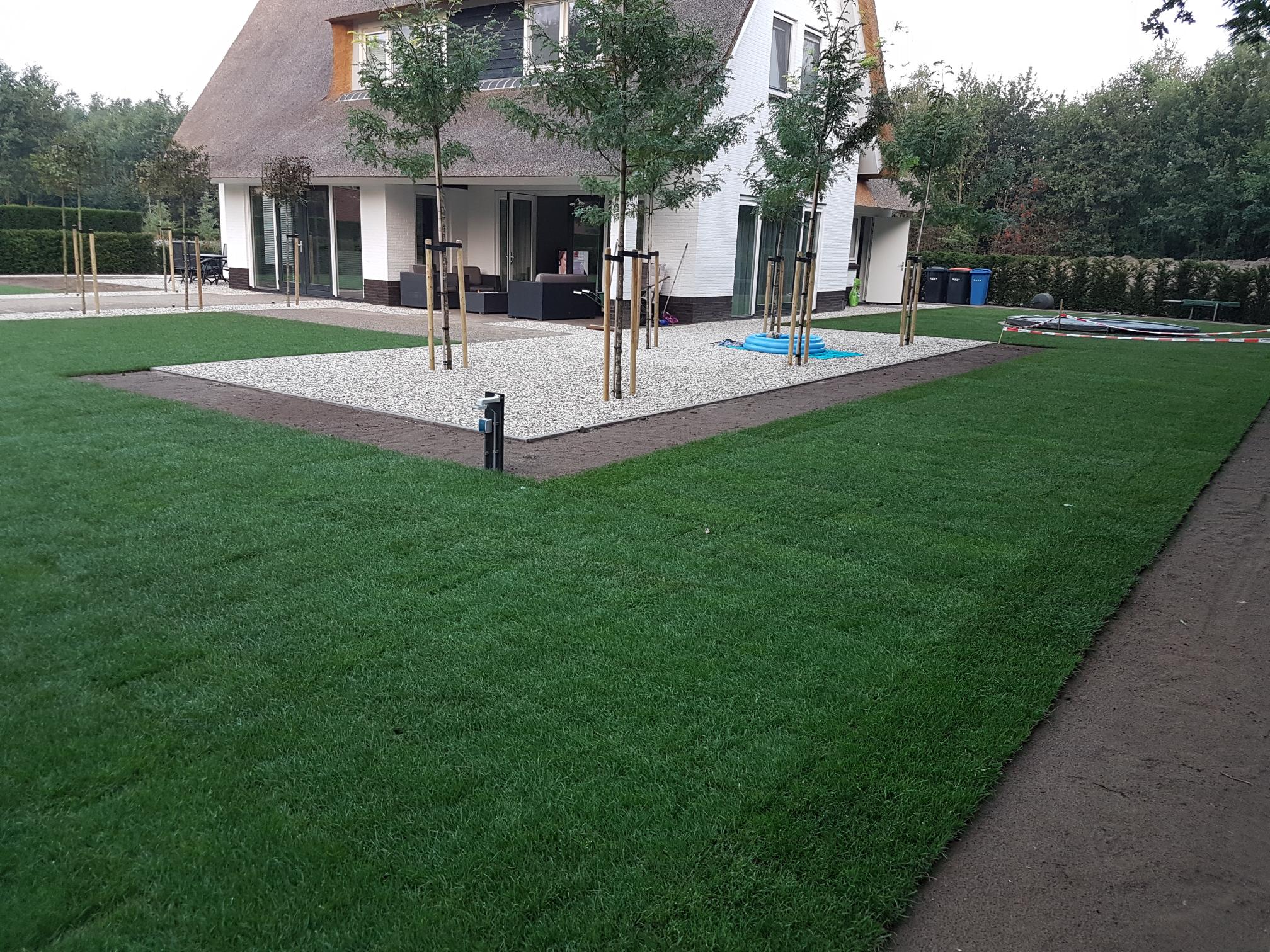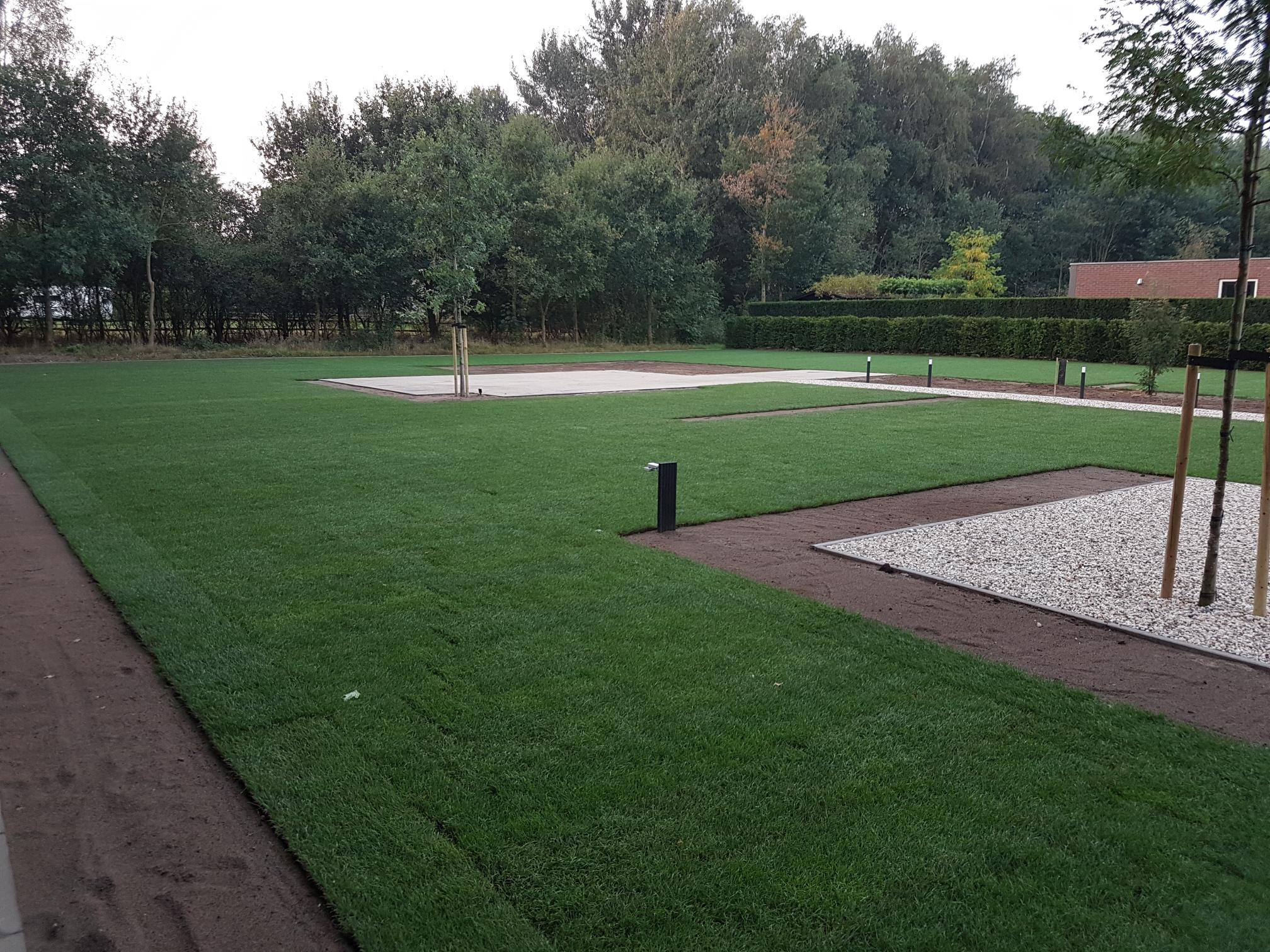 Voordat wij 750 m² graszoden hebben gelegd, hebben wij de ondergrond gefreesd, gewalst en uitgevlakt. Verder hebben wij ook nog in deze tuin In-Lite verlichting aangebracht