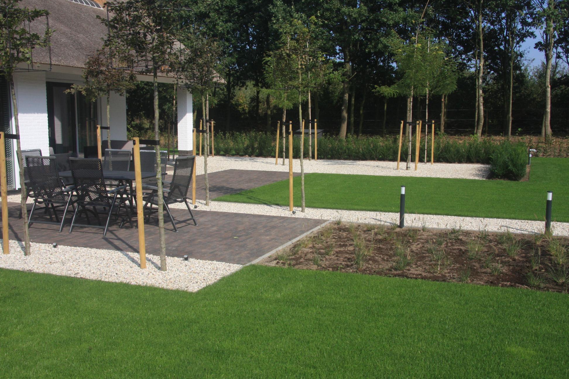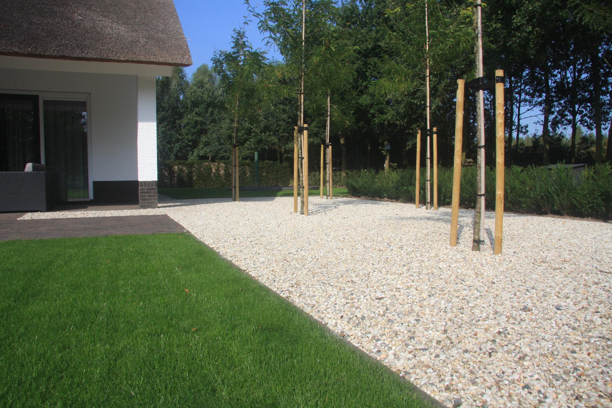 Bij deze villa in Wijthmen hebben wij diverse terrassen aangelegd met verschillende materialen, namelijk met gebakken waaltjes en betonnen tegels. De paden en overige verharde delen hebben wij voorzien van een ondergrond van visiegravel met daarop grind.